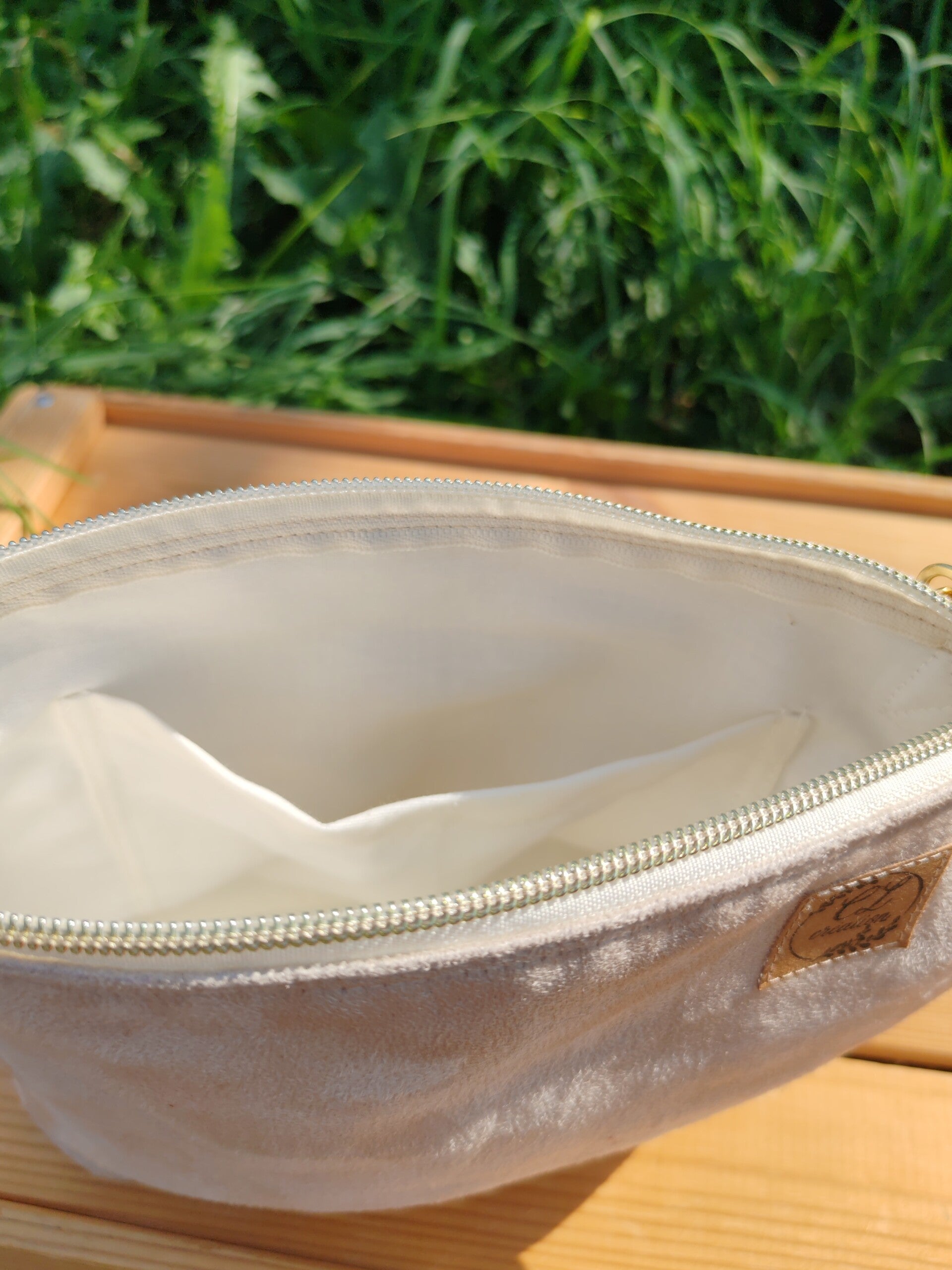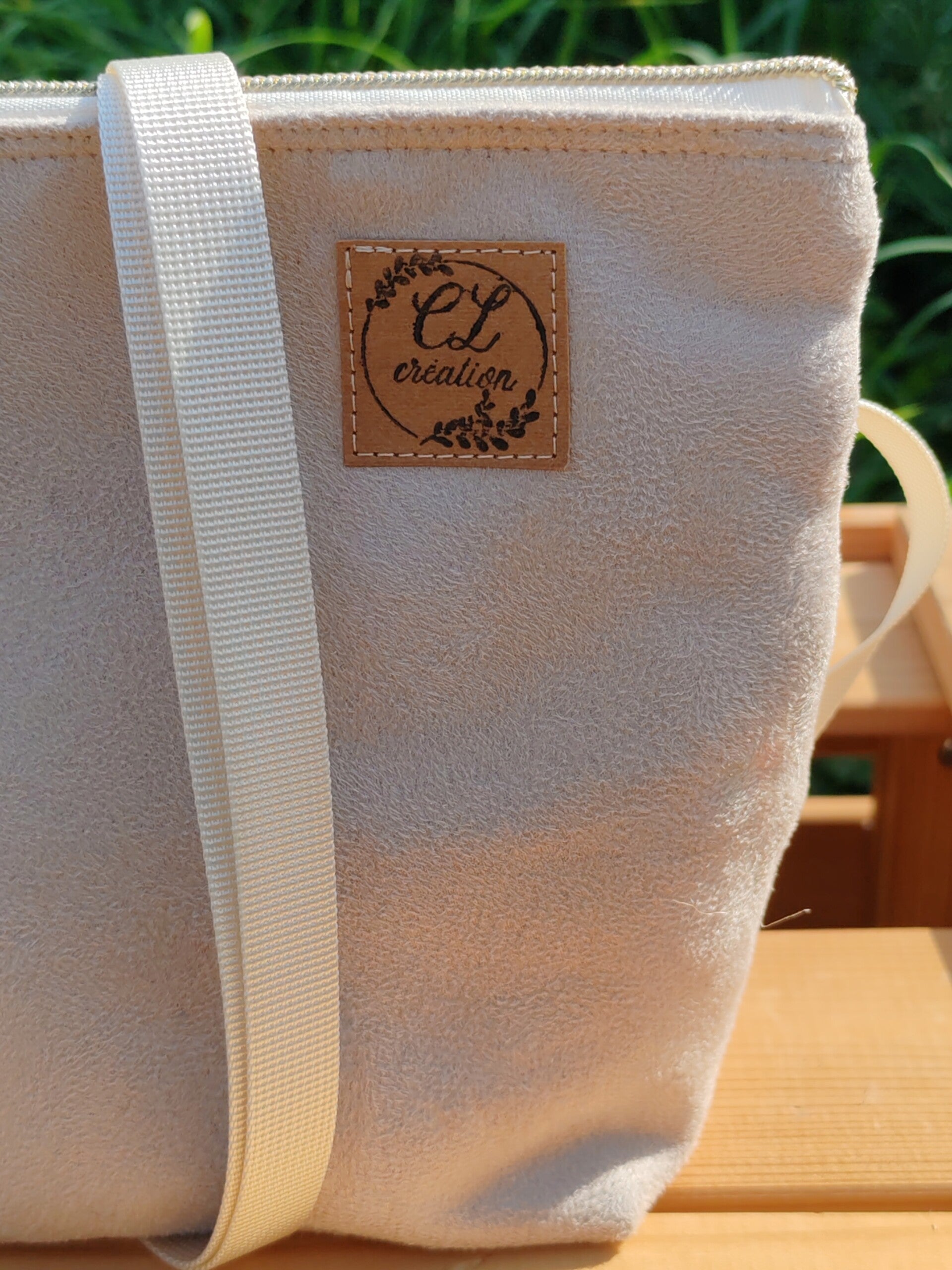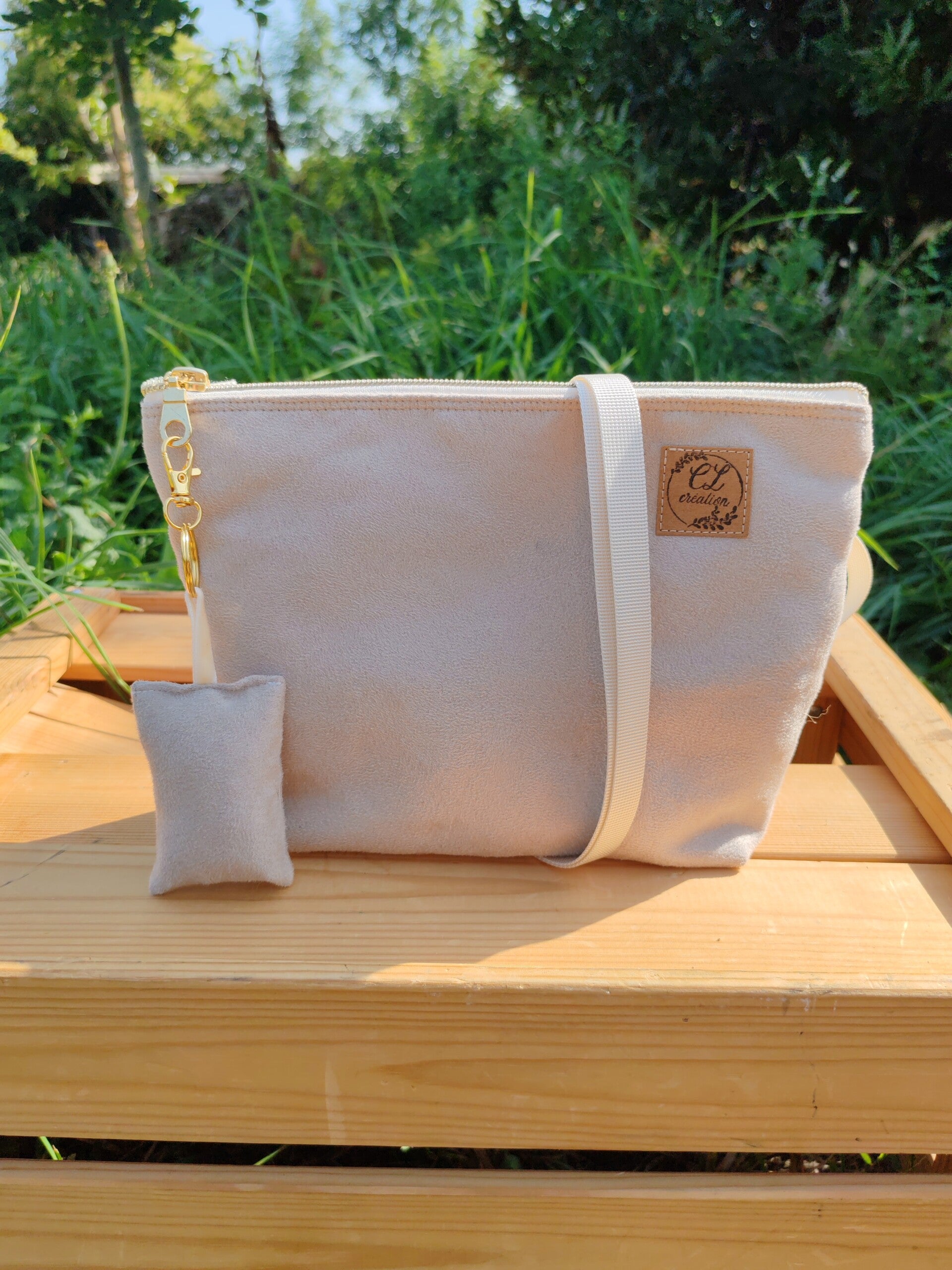 Joli petit sac bandoulière en nubuck beige clair, doublé avec une poche intérieure plaquée.