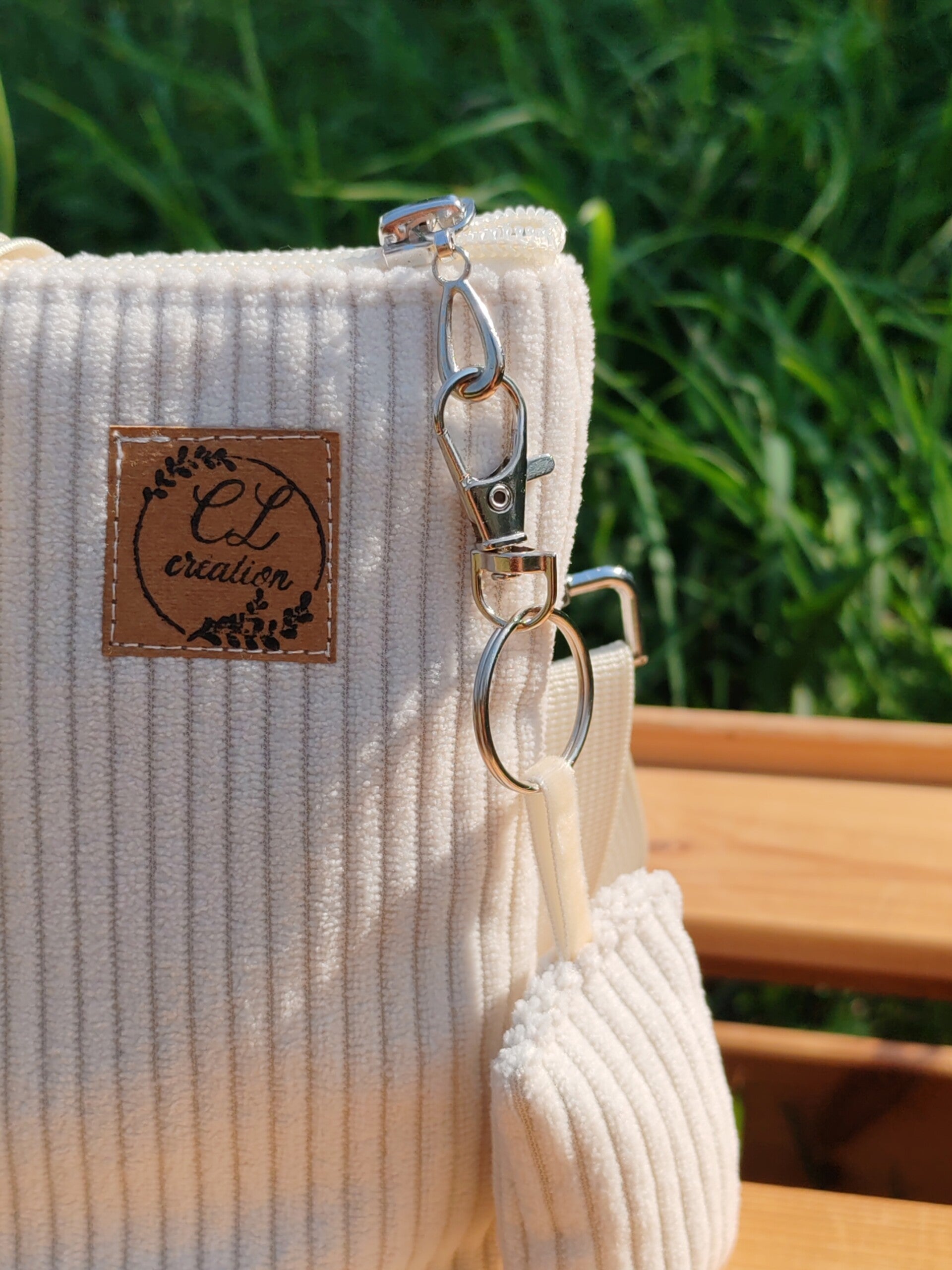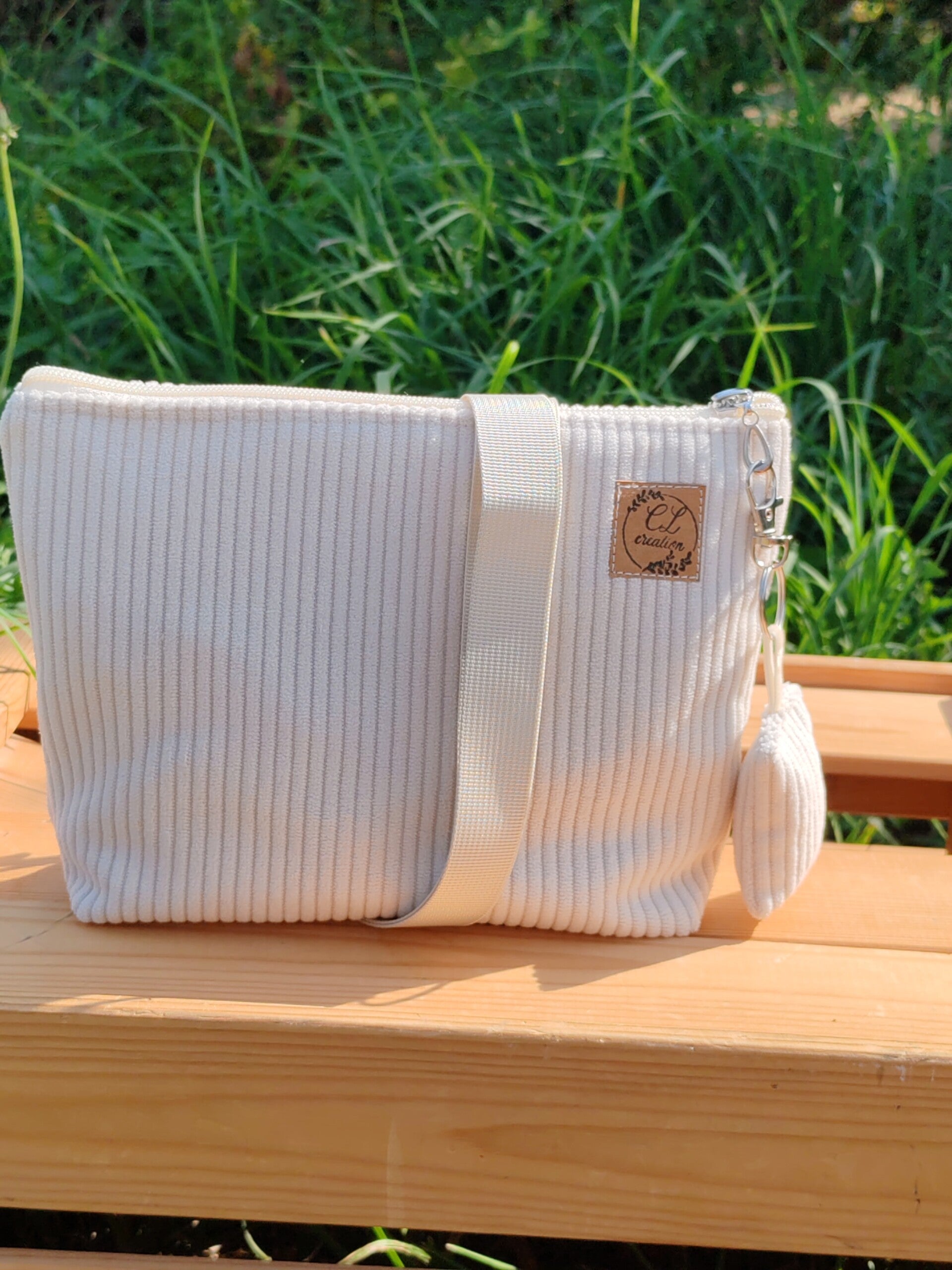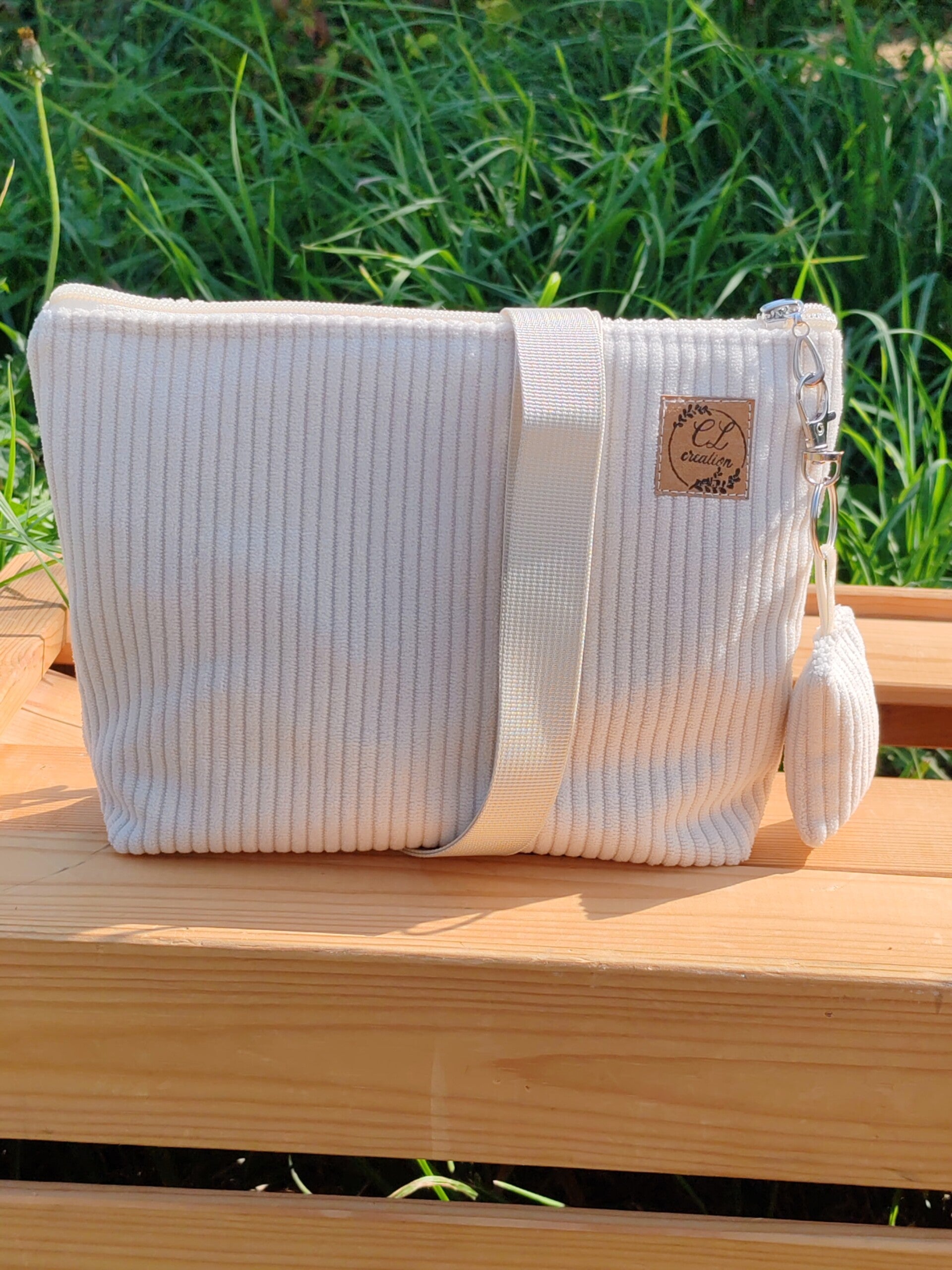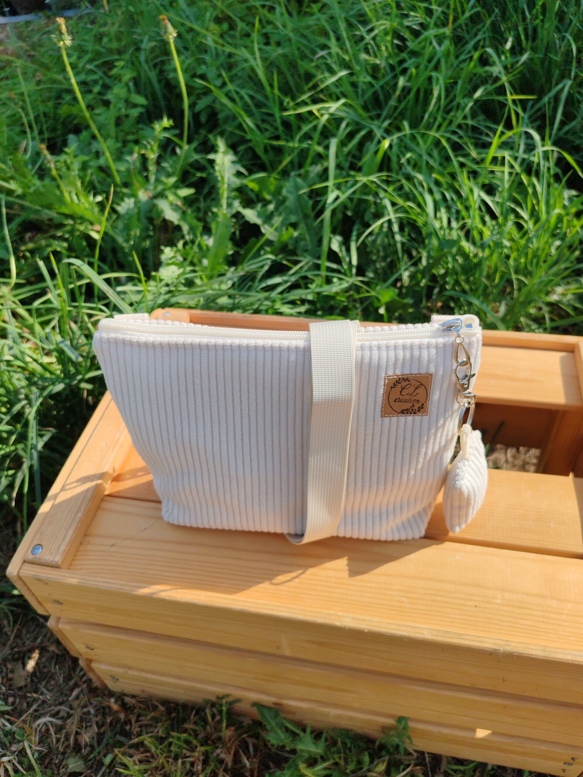 Joli petit sac bandoulière en velours écru, doublé avec une poche intérieure plaquée.