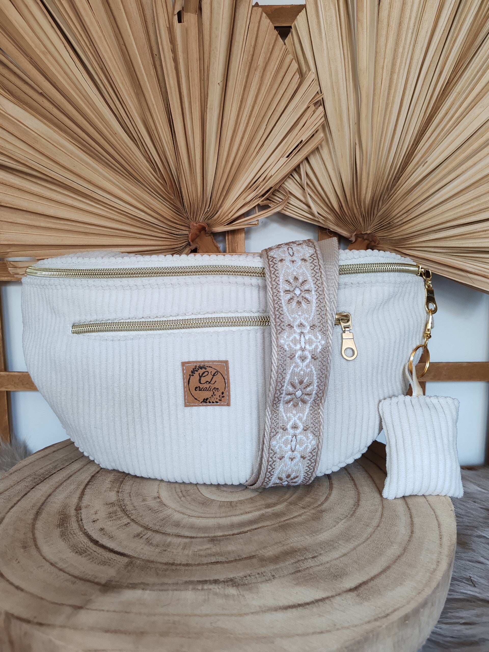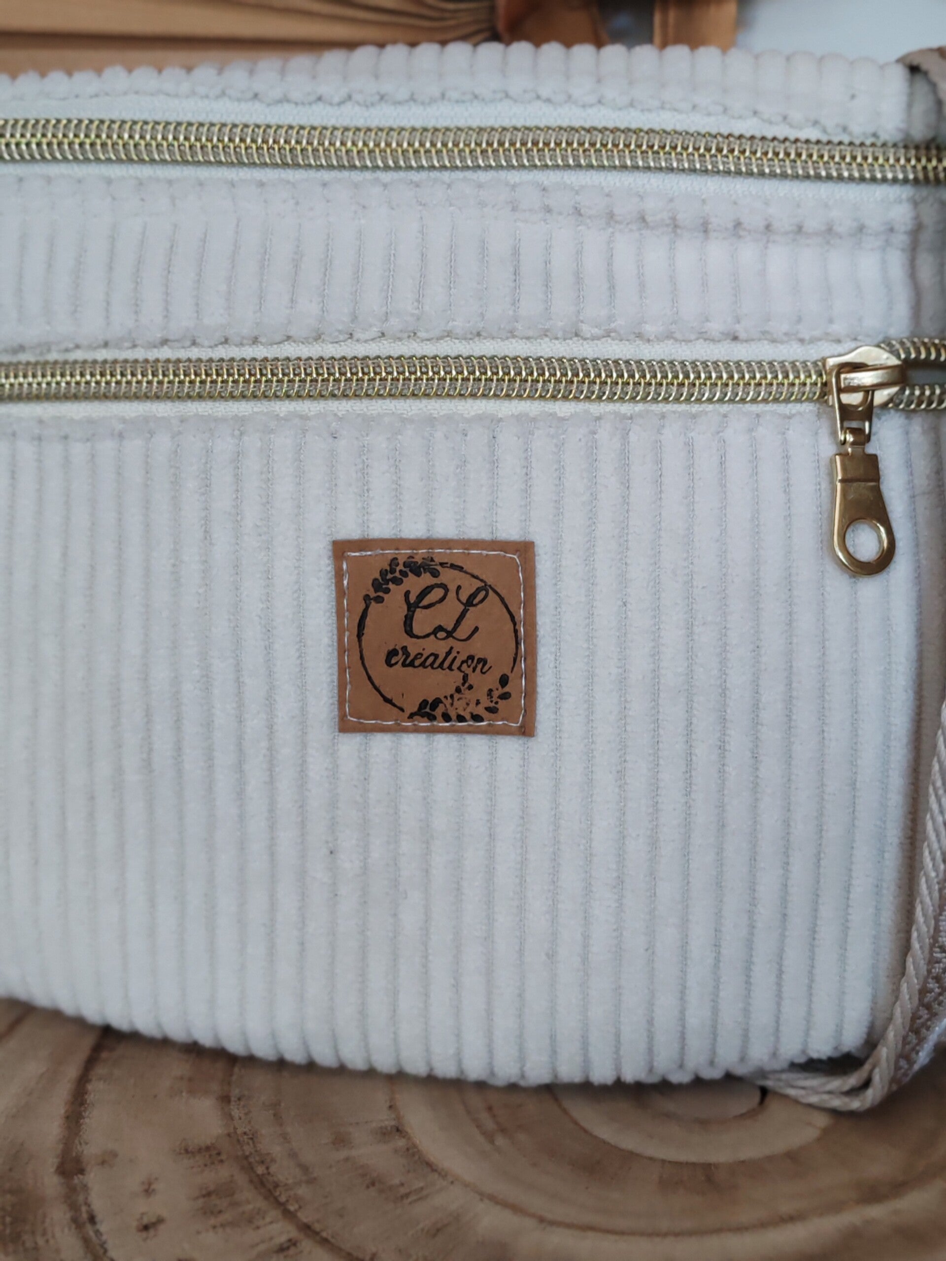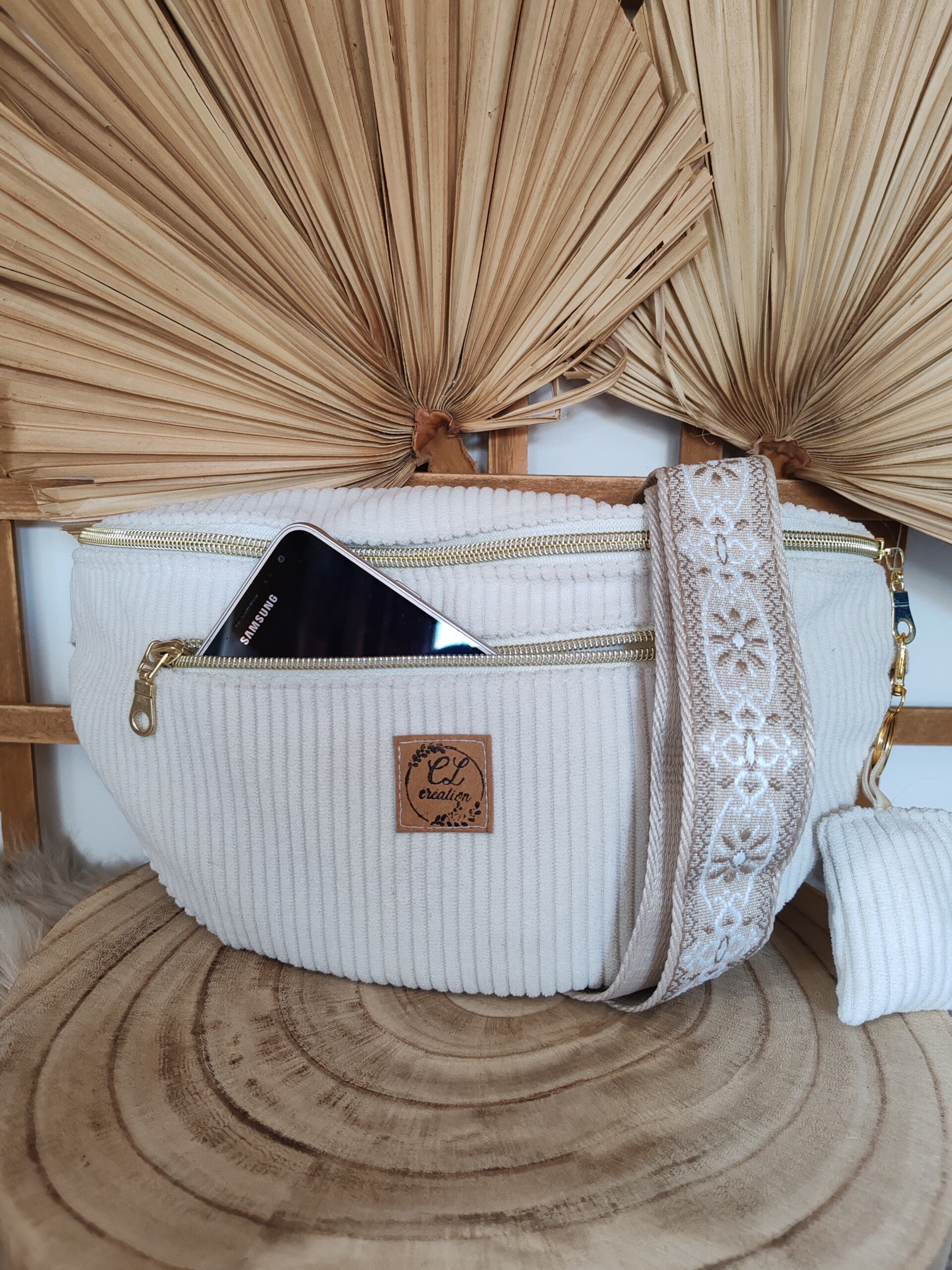 Jolie sacoche banane en velours de couleur écru, doublée avec une poche intérieure plaquée et une seconde devant zippée, pratique pour les clés, le porte monnaie, le portable etc ...