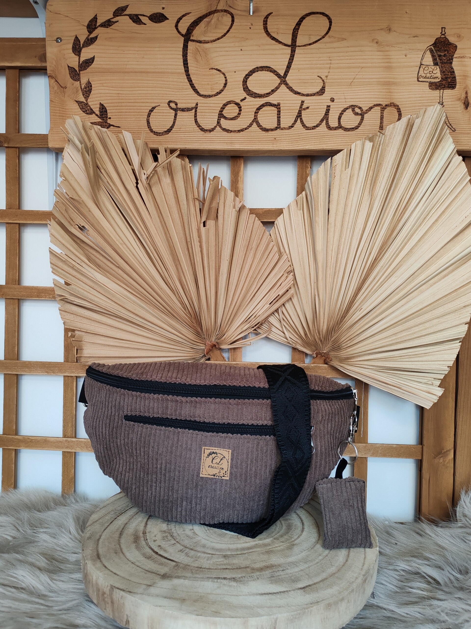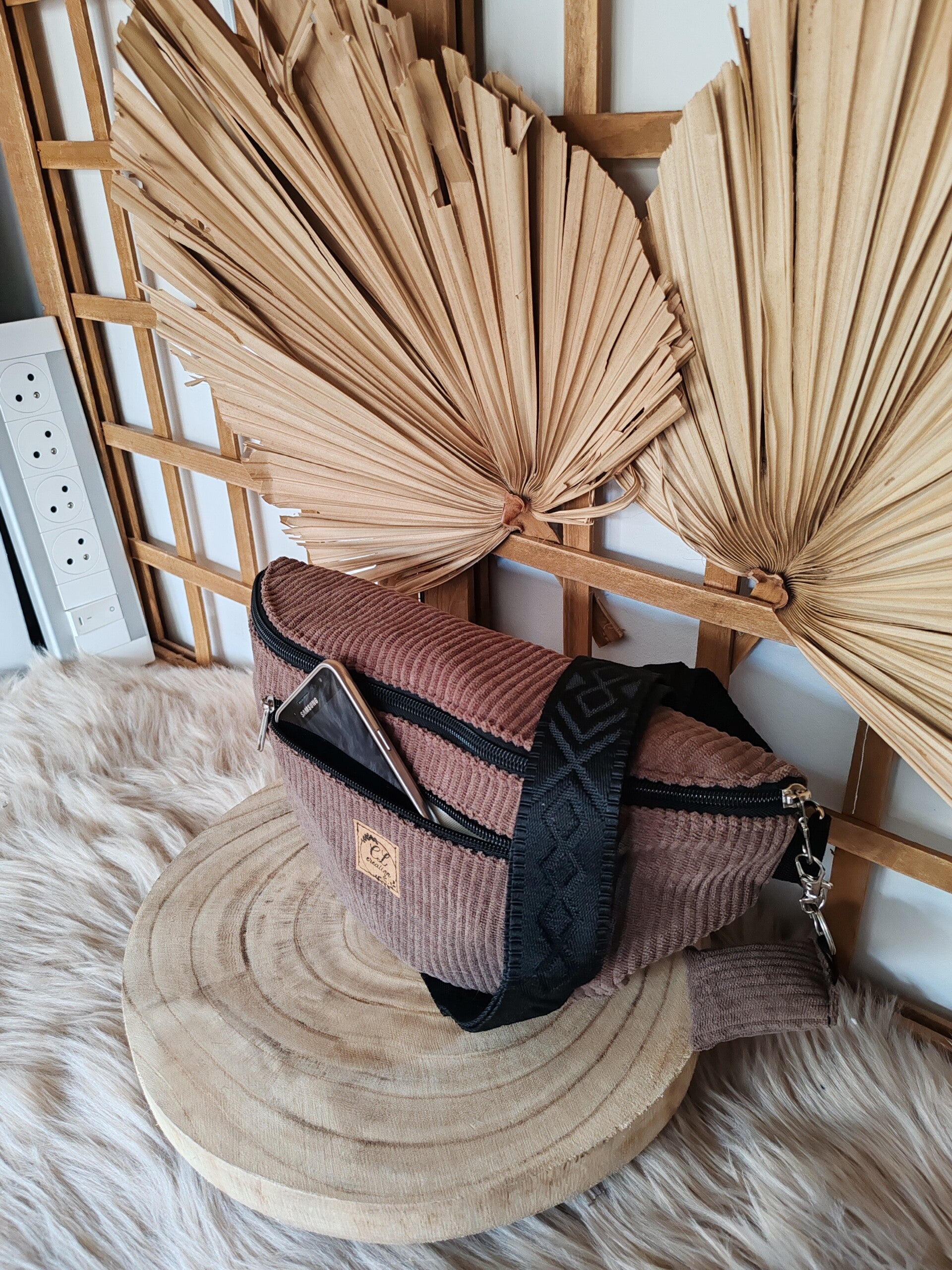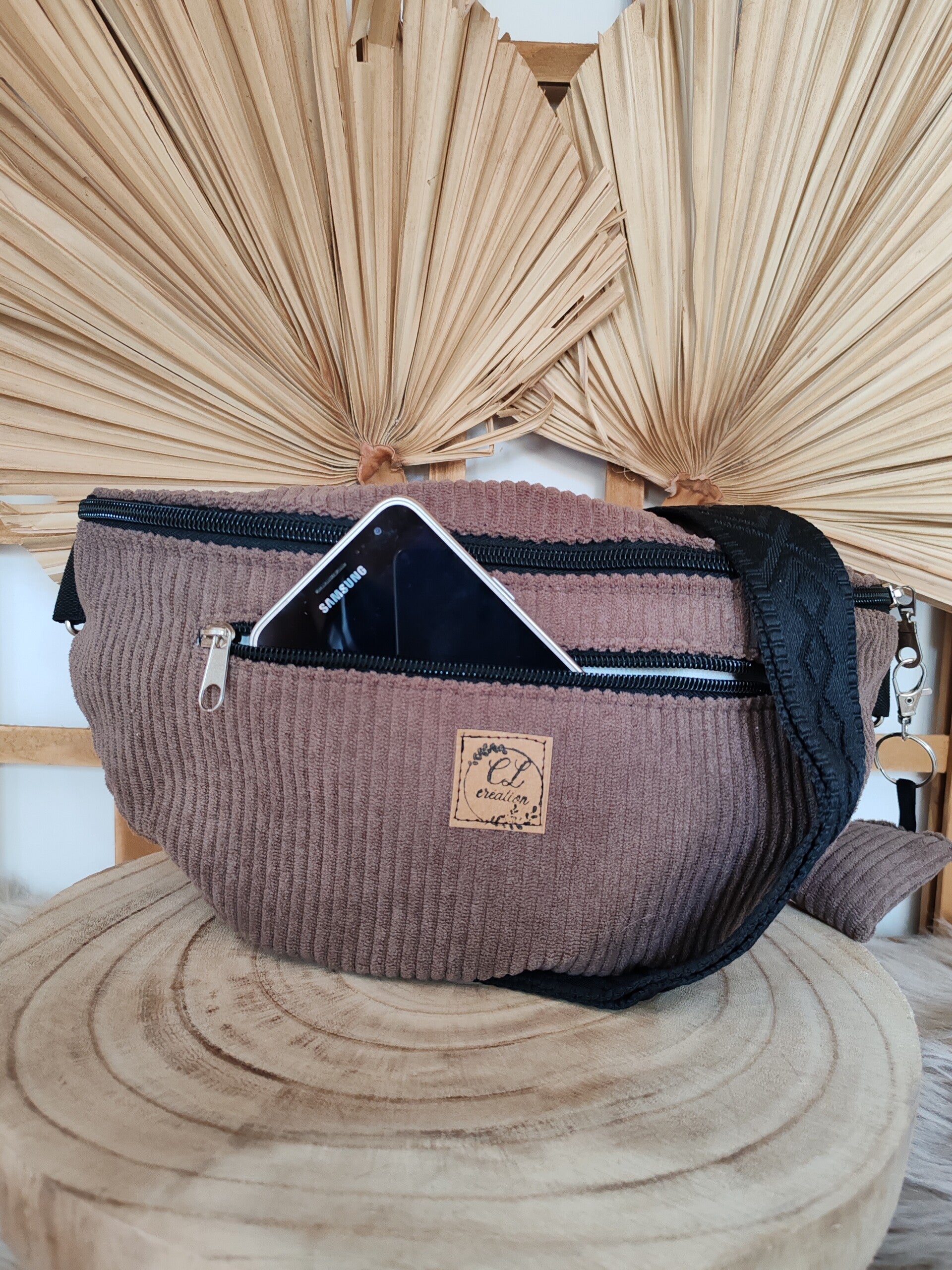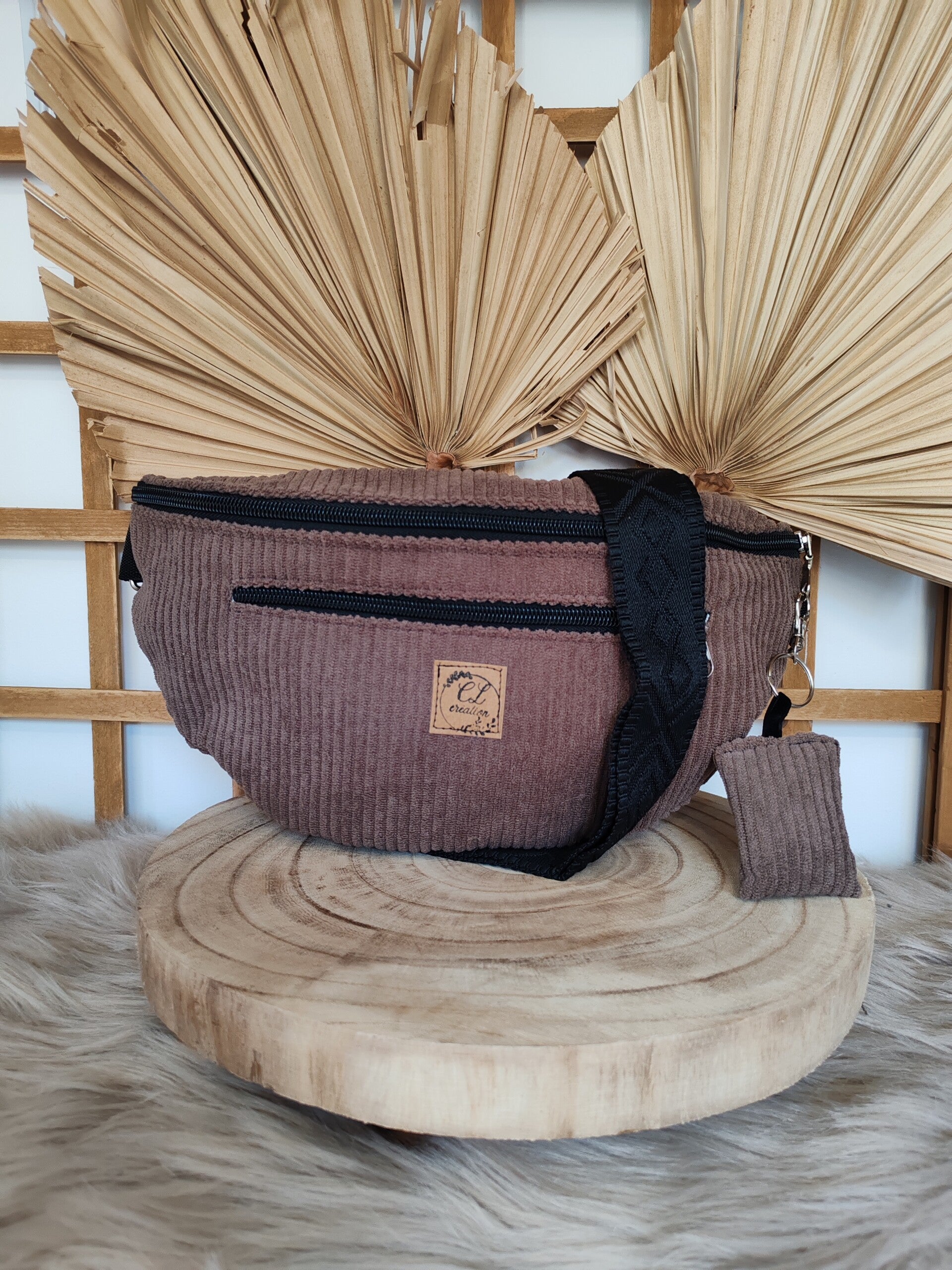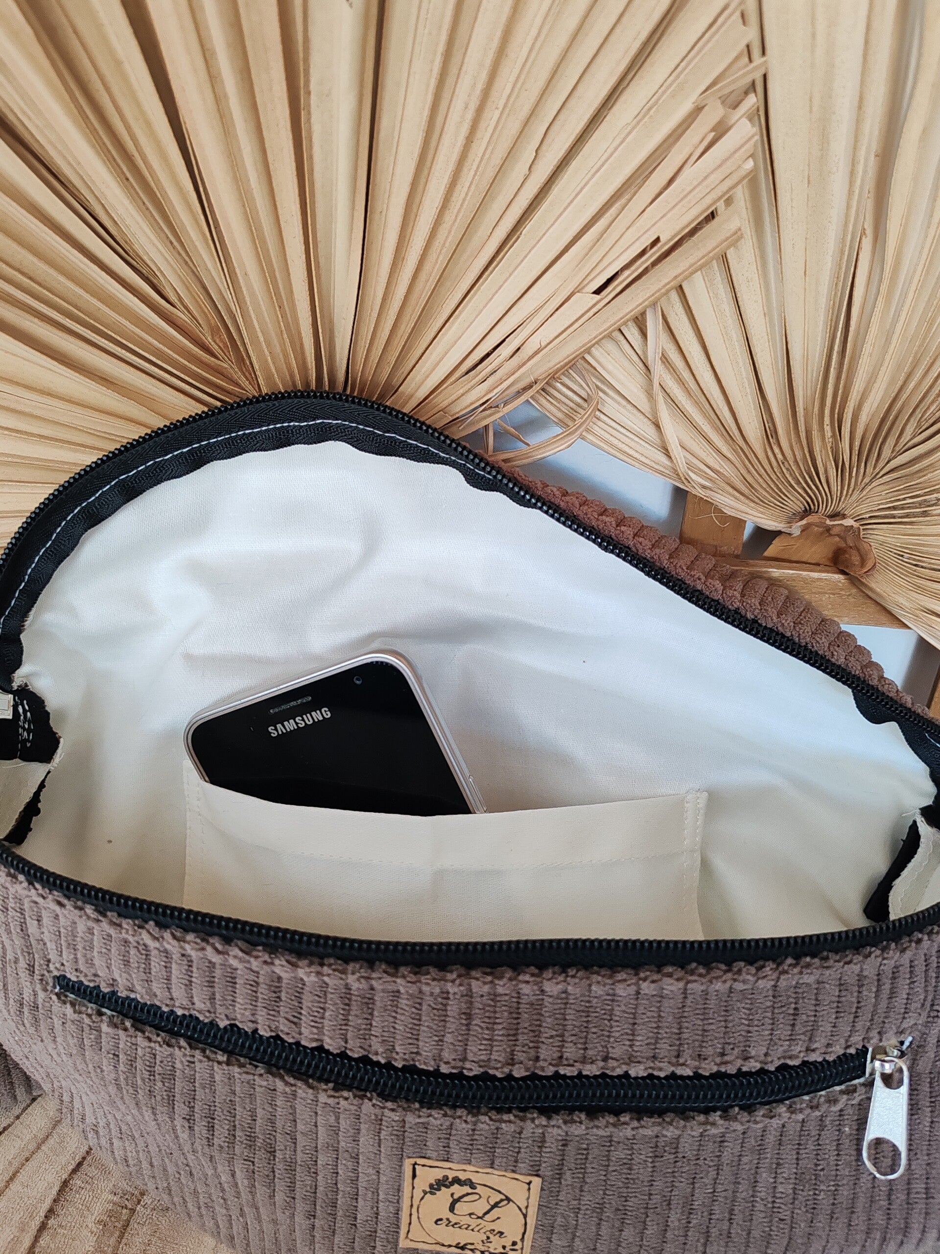Jolie sacoche banane en velours de couleur marron, doublée avec une poche intérieure plaquée et une seconde devant zippée bien pratique pour mettre le portable, les clés, la monnaie ou bien les papiers importants.