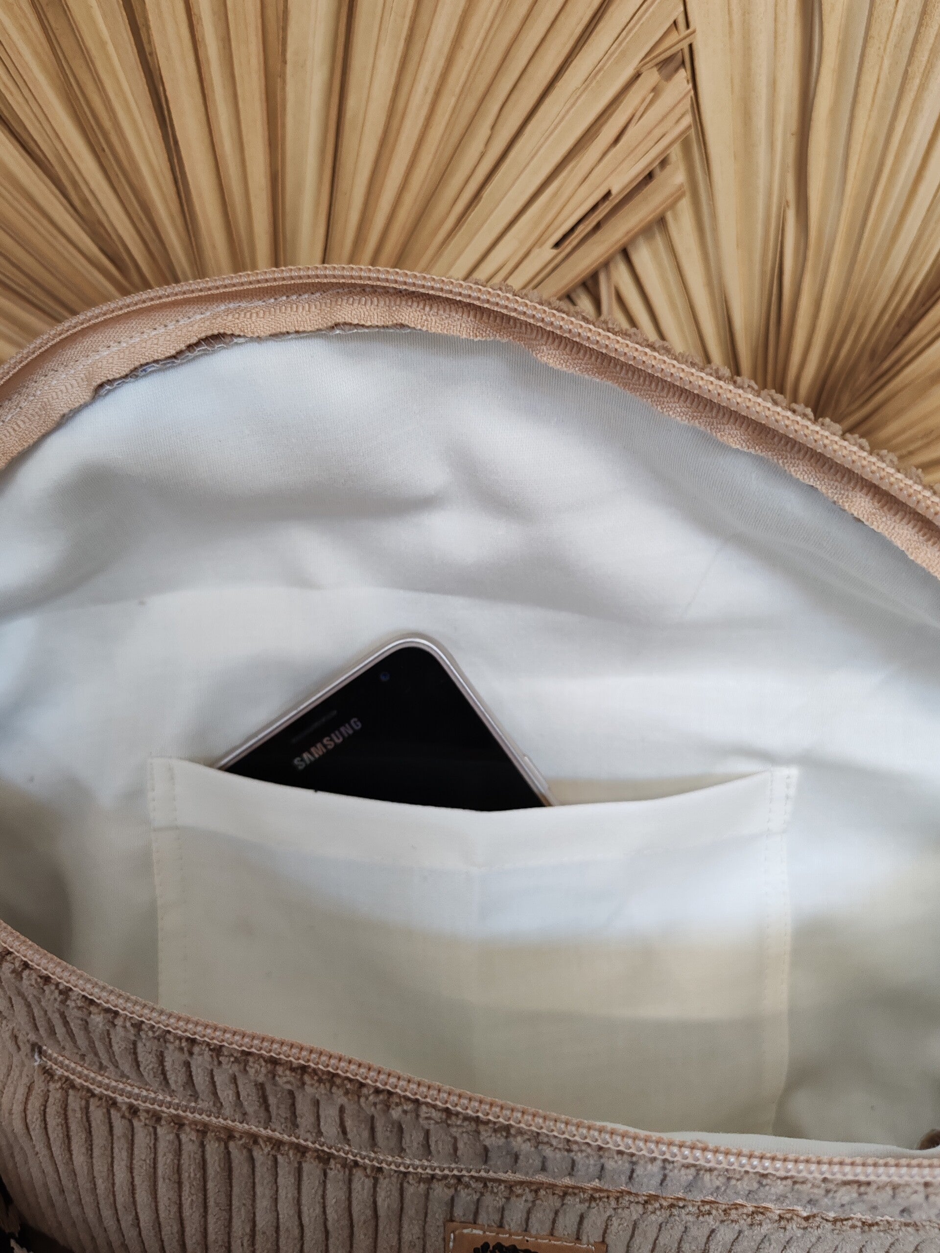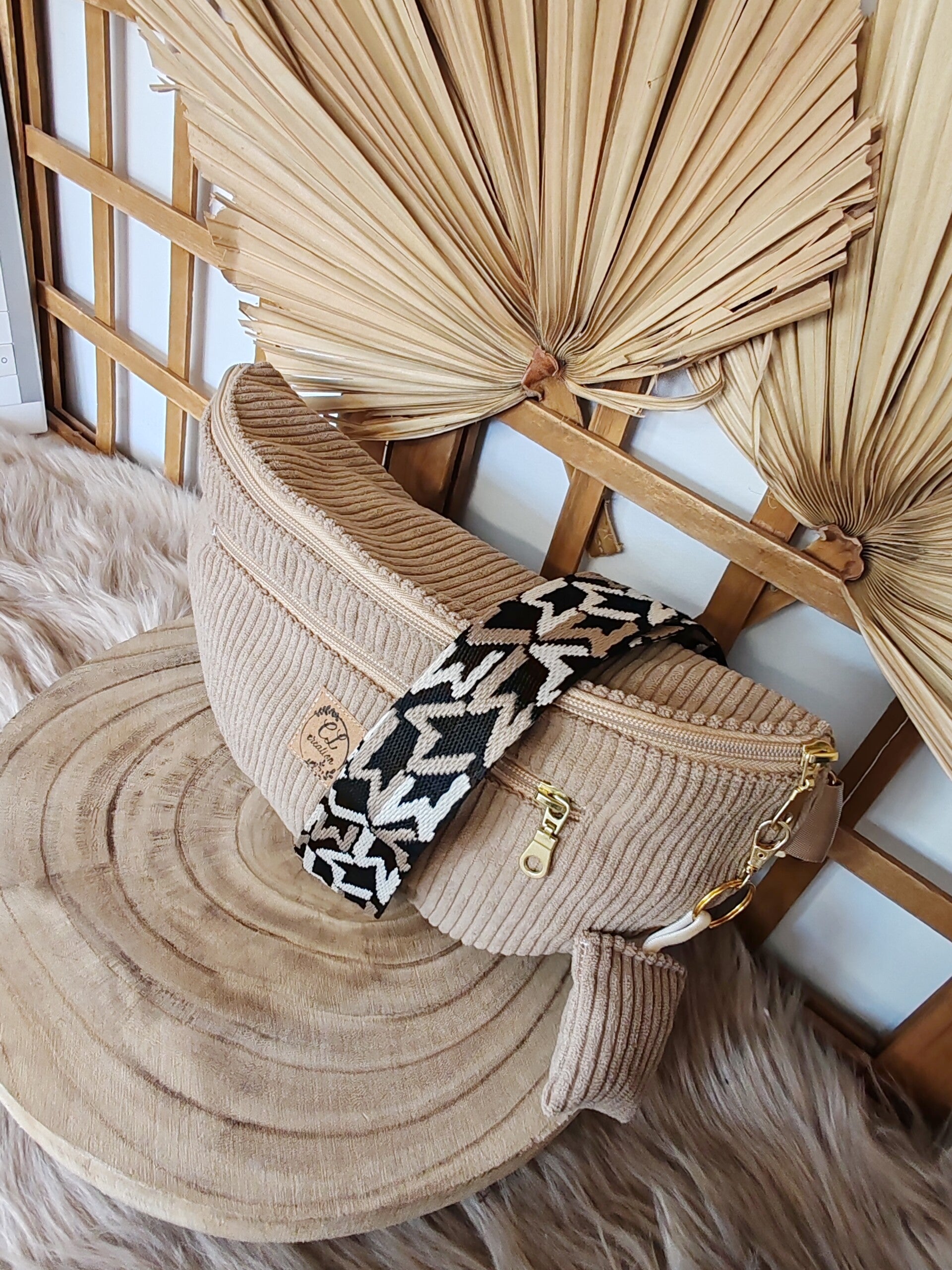 Jolie sacoche banane en velours de couleur beige, doublée avec une poche intérieure et une seconde devant zippée, pratique pour y glisser le portable, les clés, la monnaie ou les papiers 😉