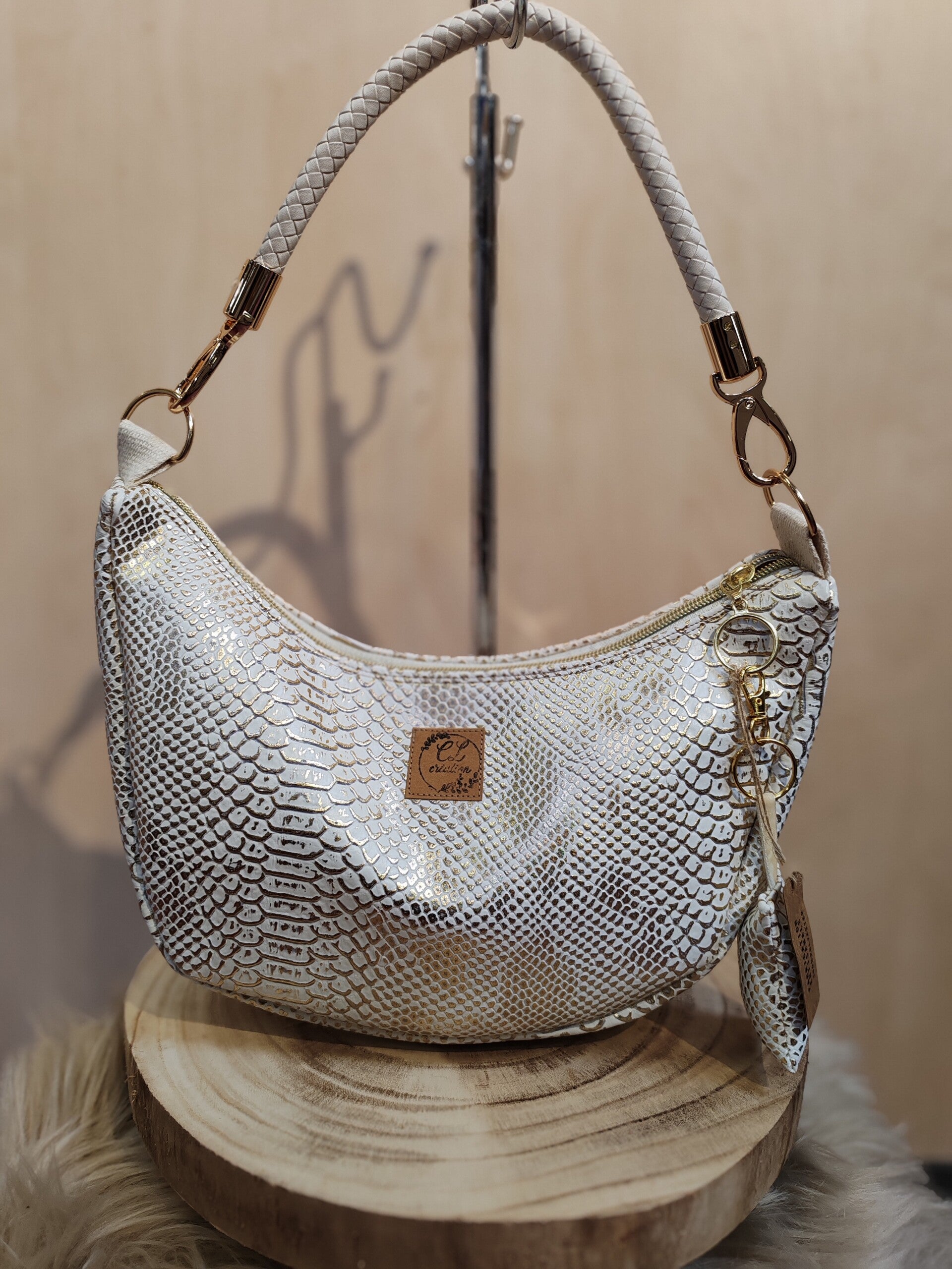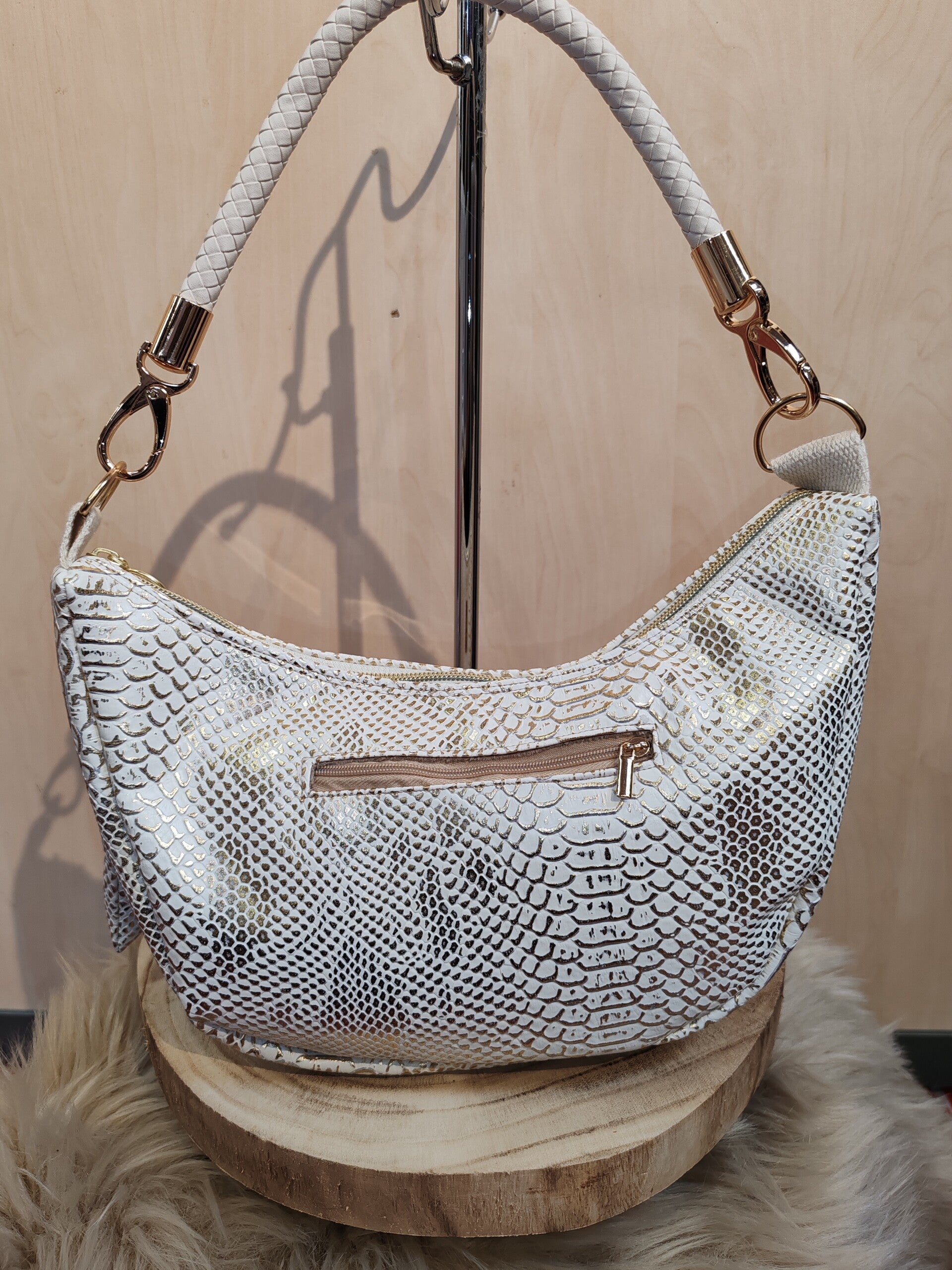 Dans la tendance, le sac demi-lune en simili cuir imitation peau de serpent blanc et doré, doublé avec une poche intérieure plaquée et une poche derrière zippée.