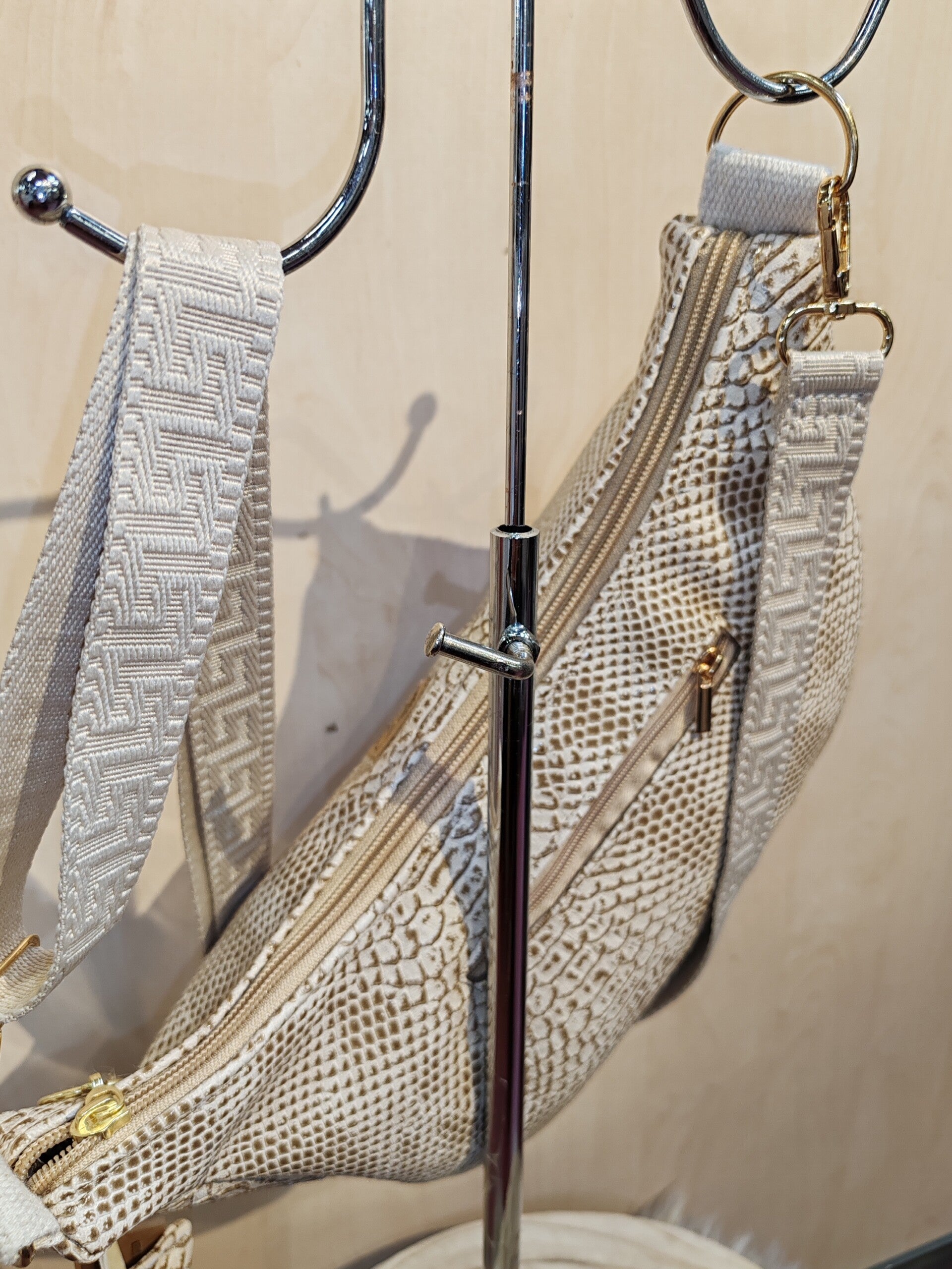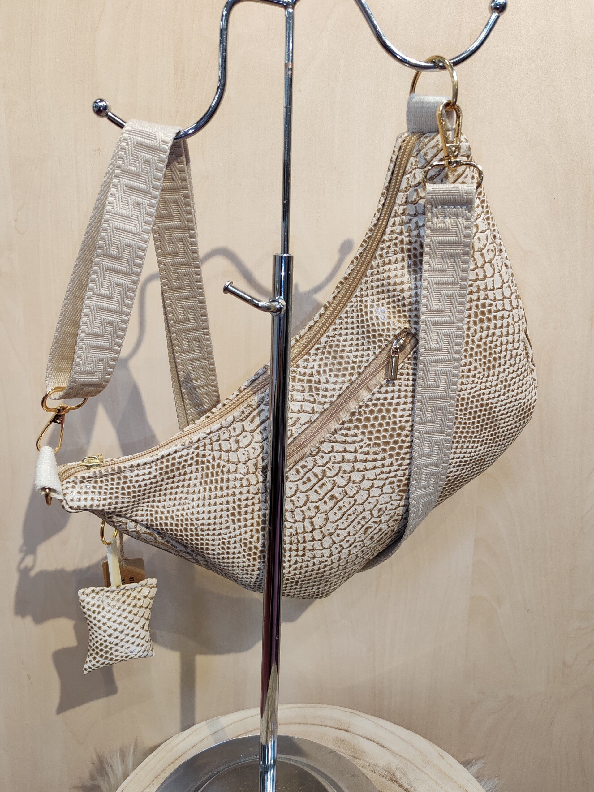 Joli sac forme demi-lune très tendance, doublé avec une poche intérieure plaquée et une poche derrière zippée.
