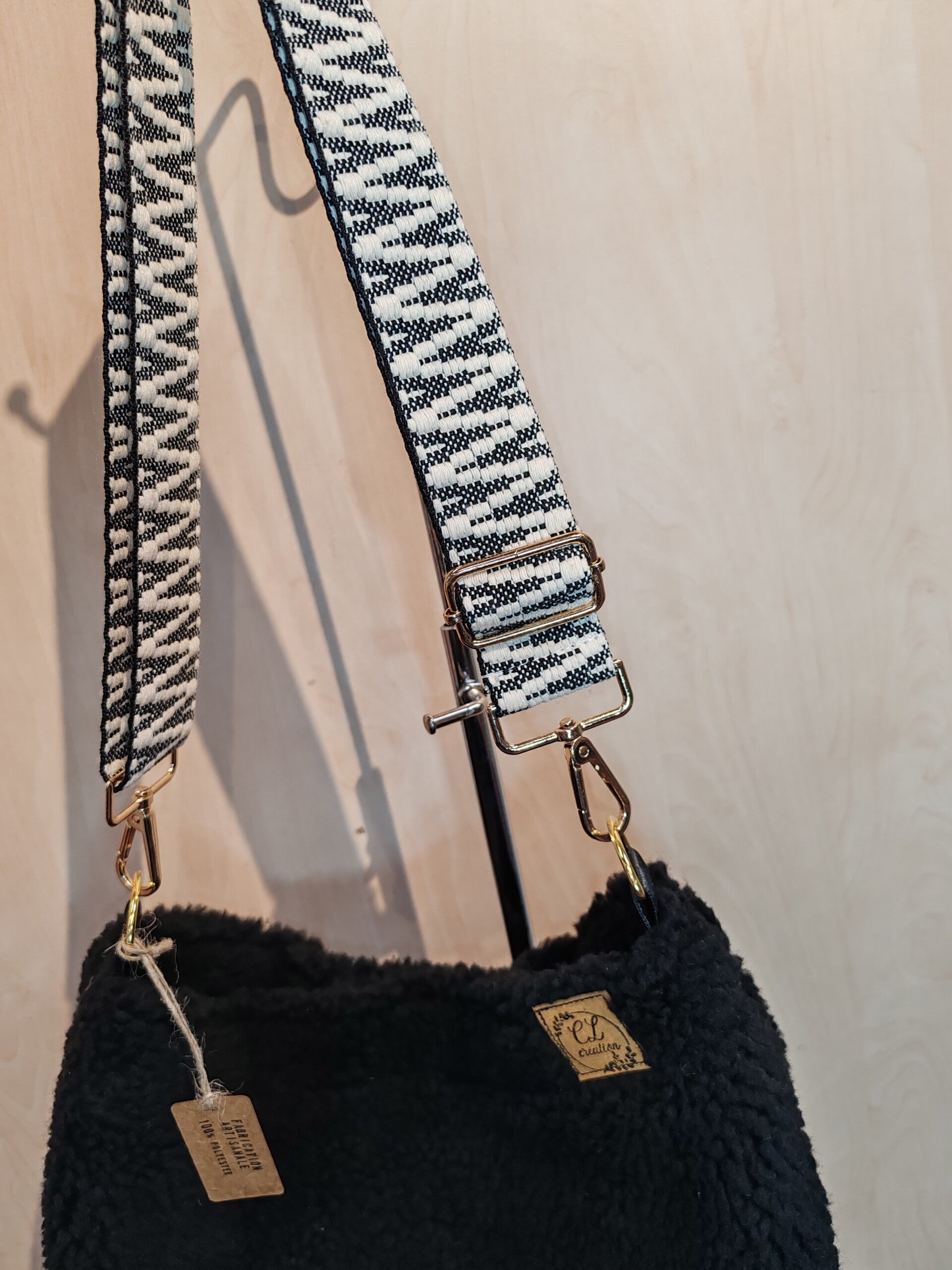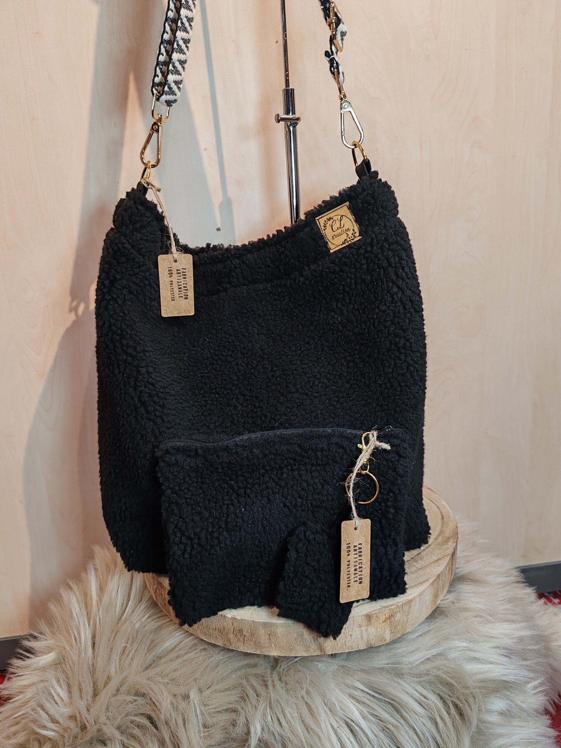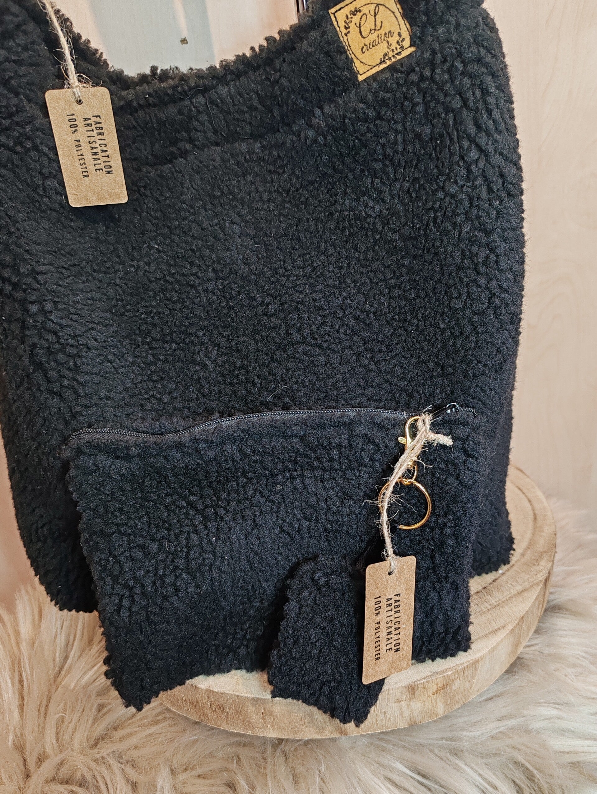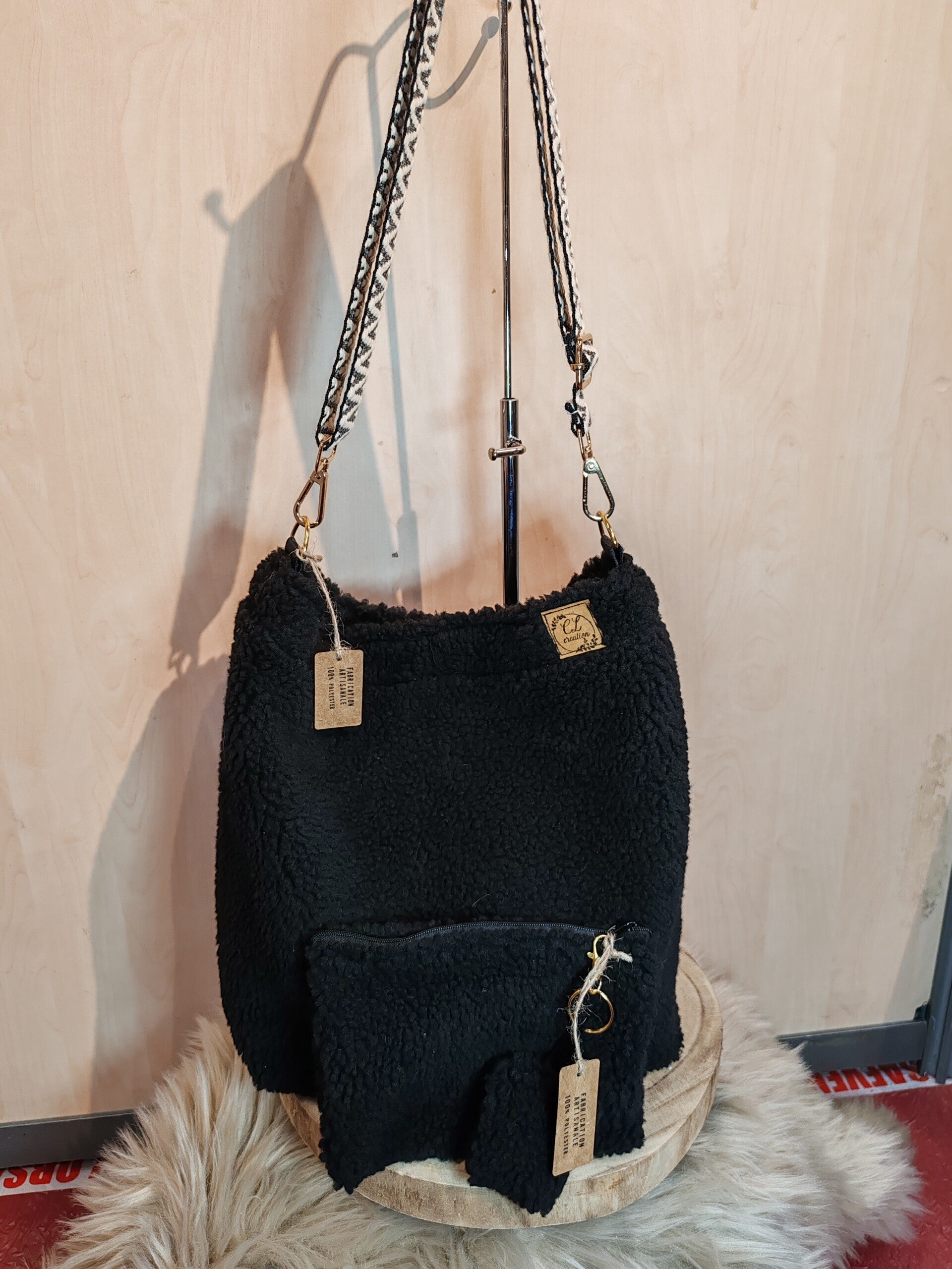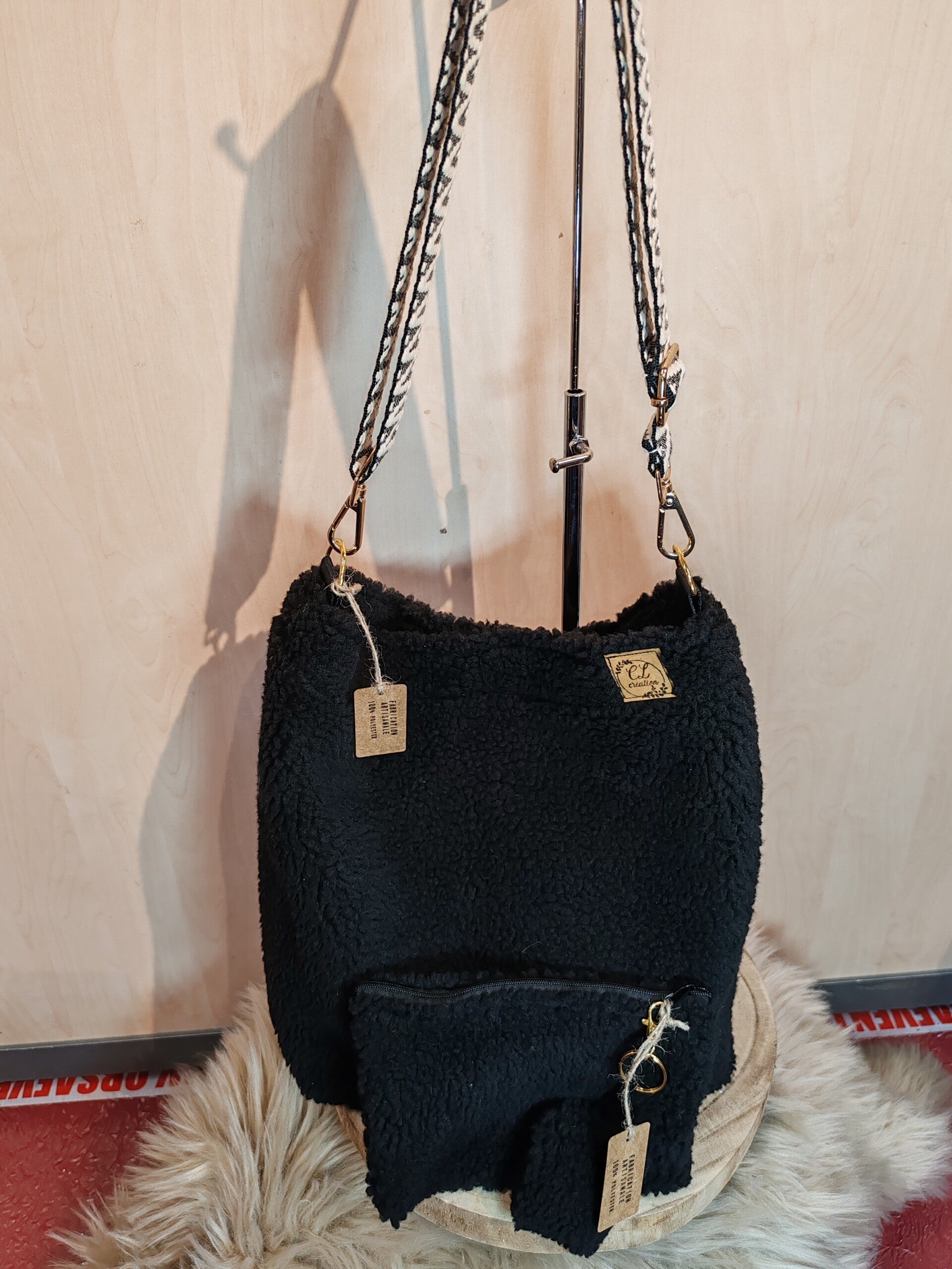 Sac bandoulière en moumoute noire, doublé avec une poche intérieure plaquée.