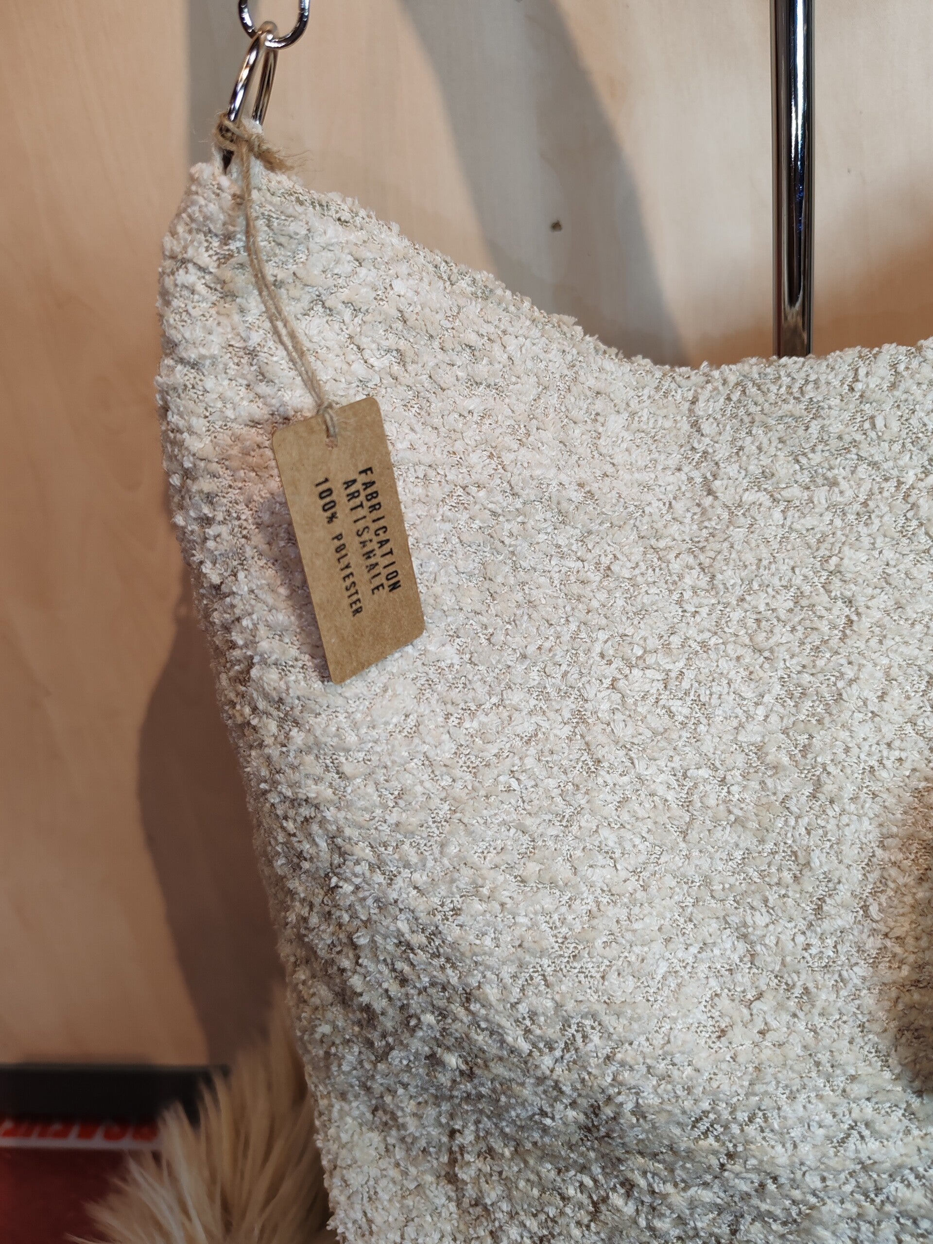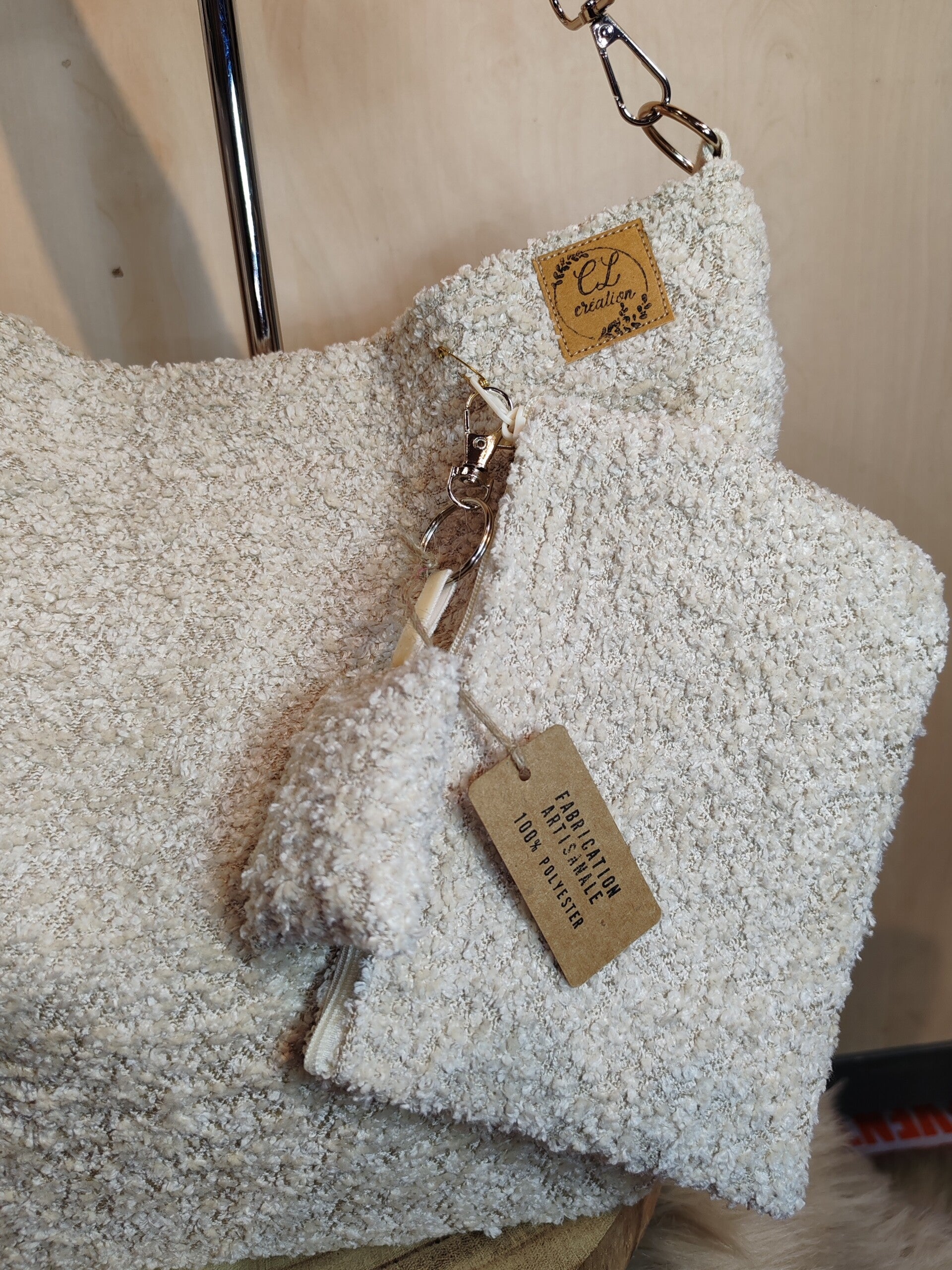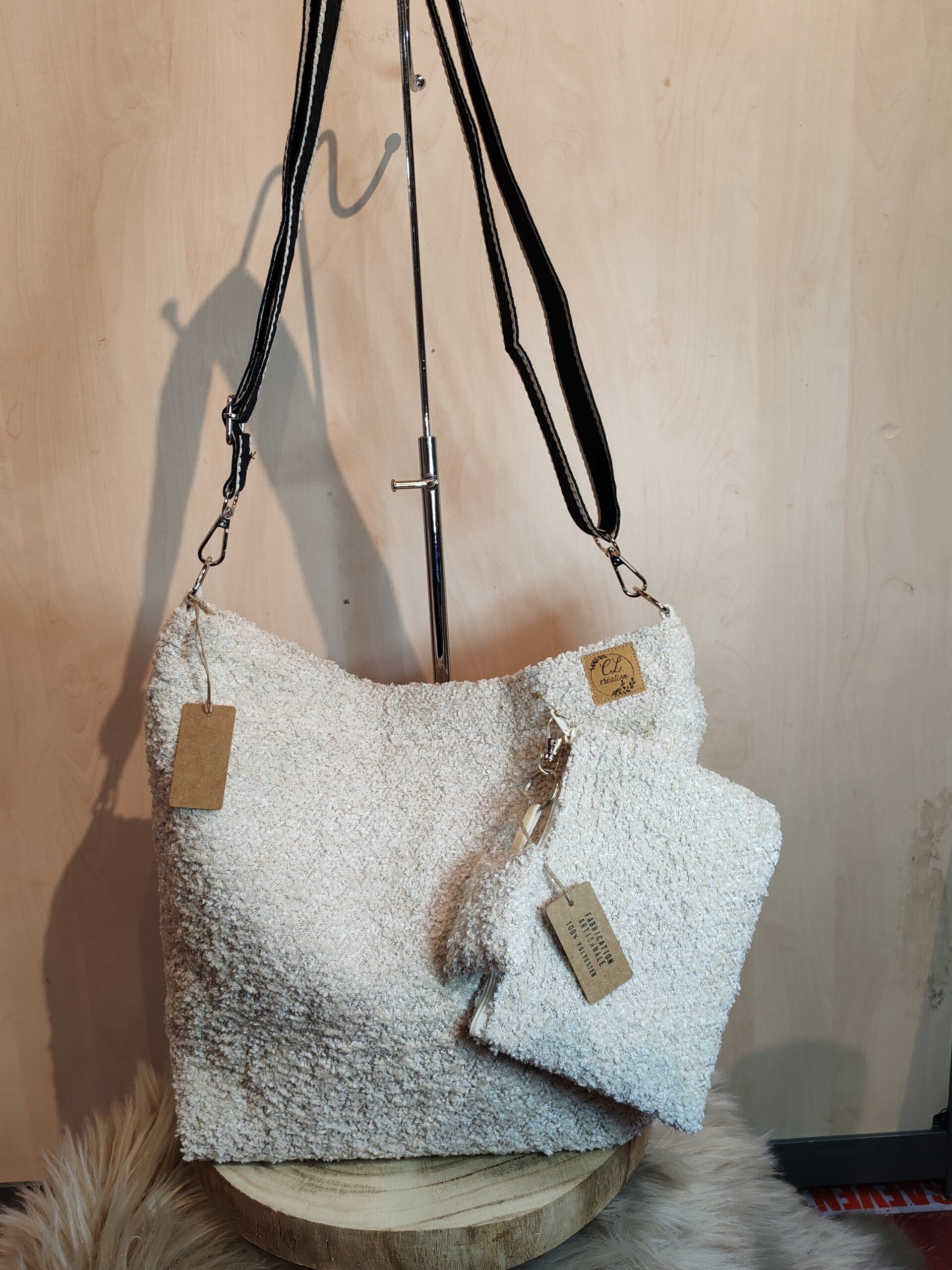 Joli sac bandoulière en moumoute de couleur écru, doublé avec une poche intérieure plaquée.