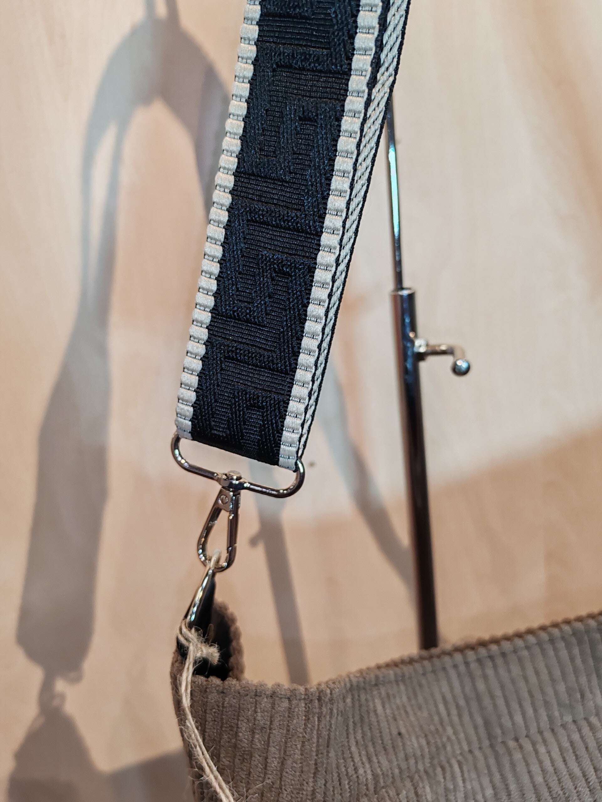 Joli sac bandoulière en velours côtelé de couleur marron, doublé avec une poche intérieure plaquée.