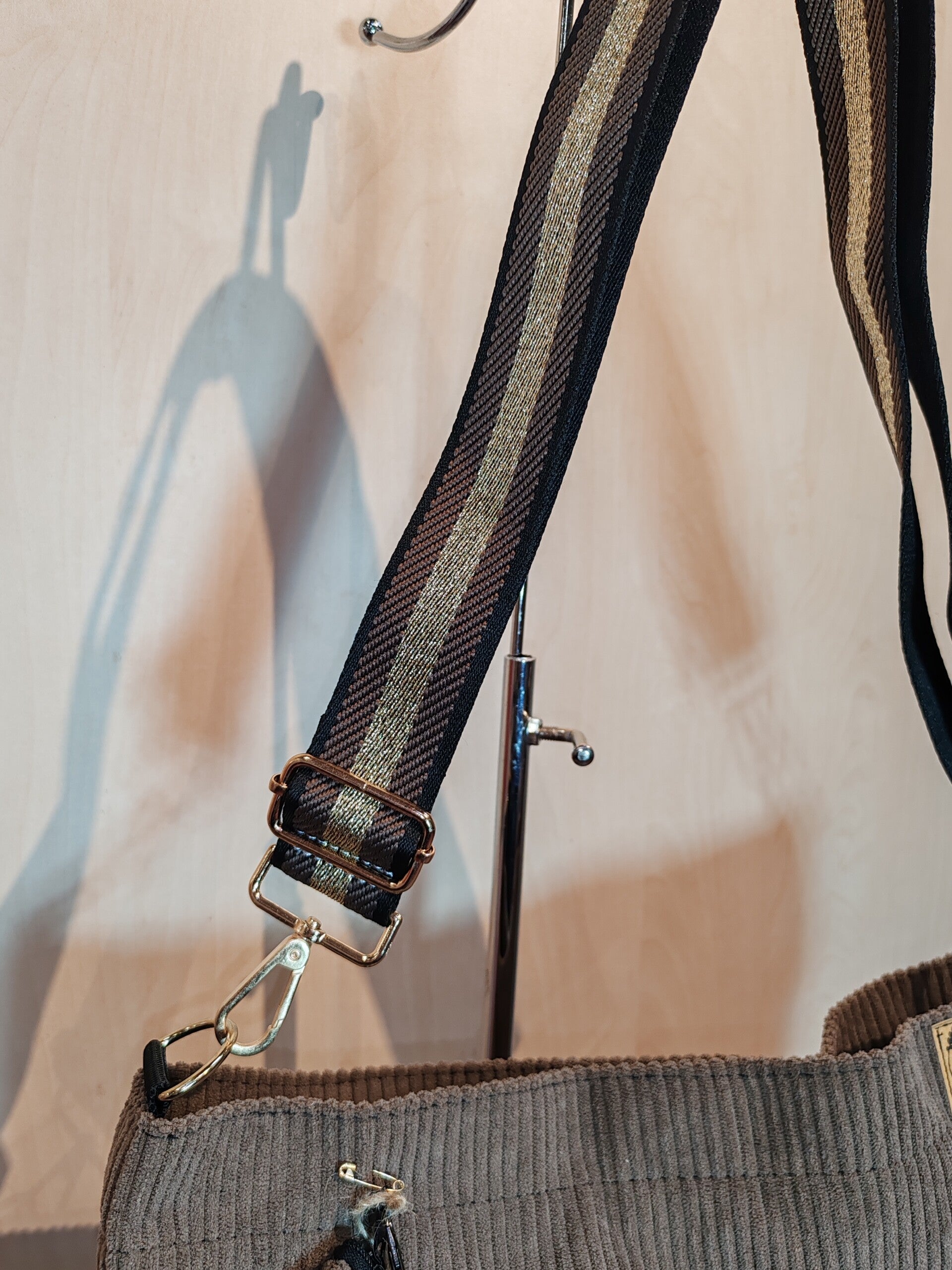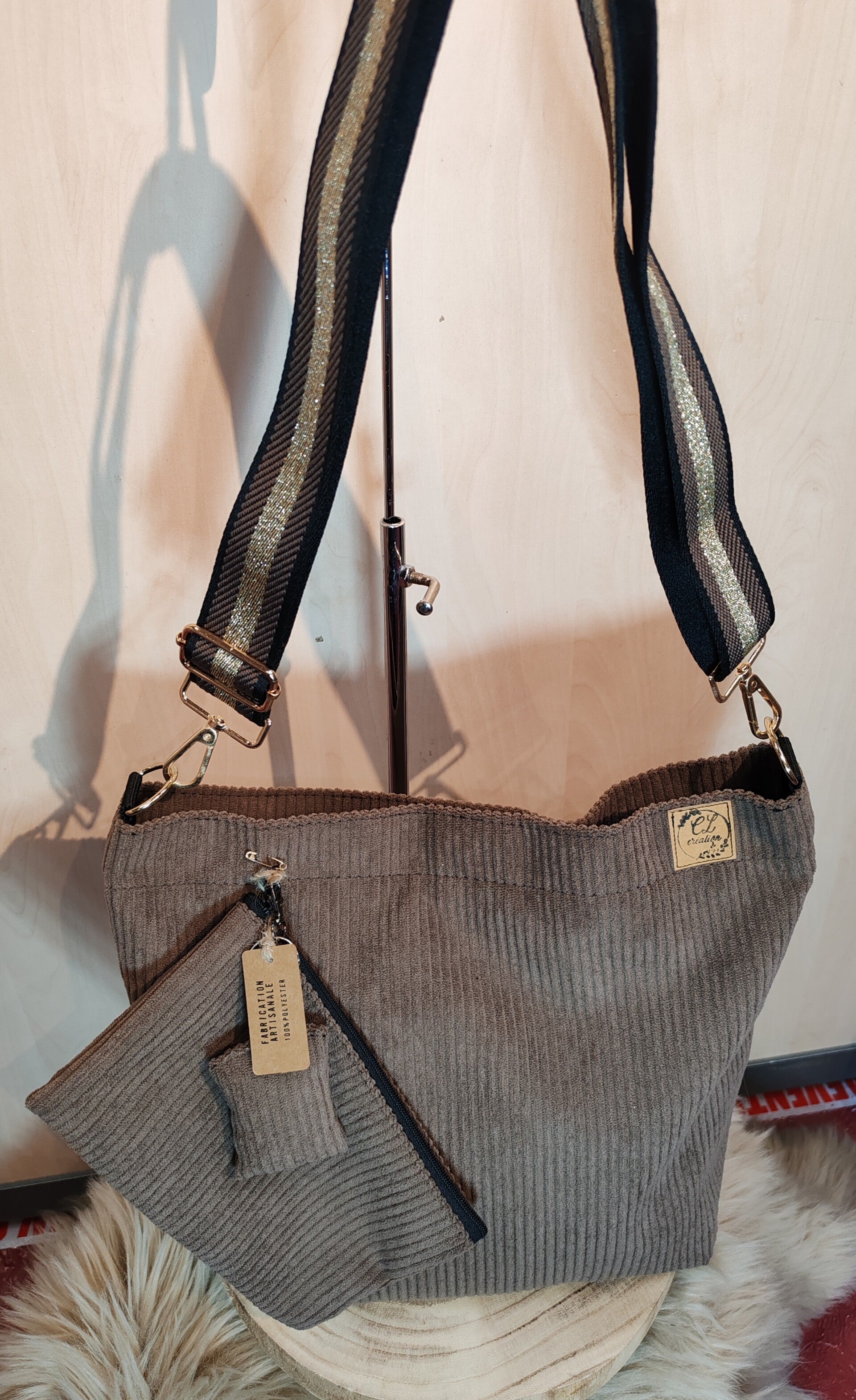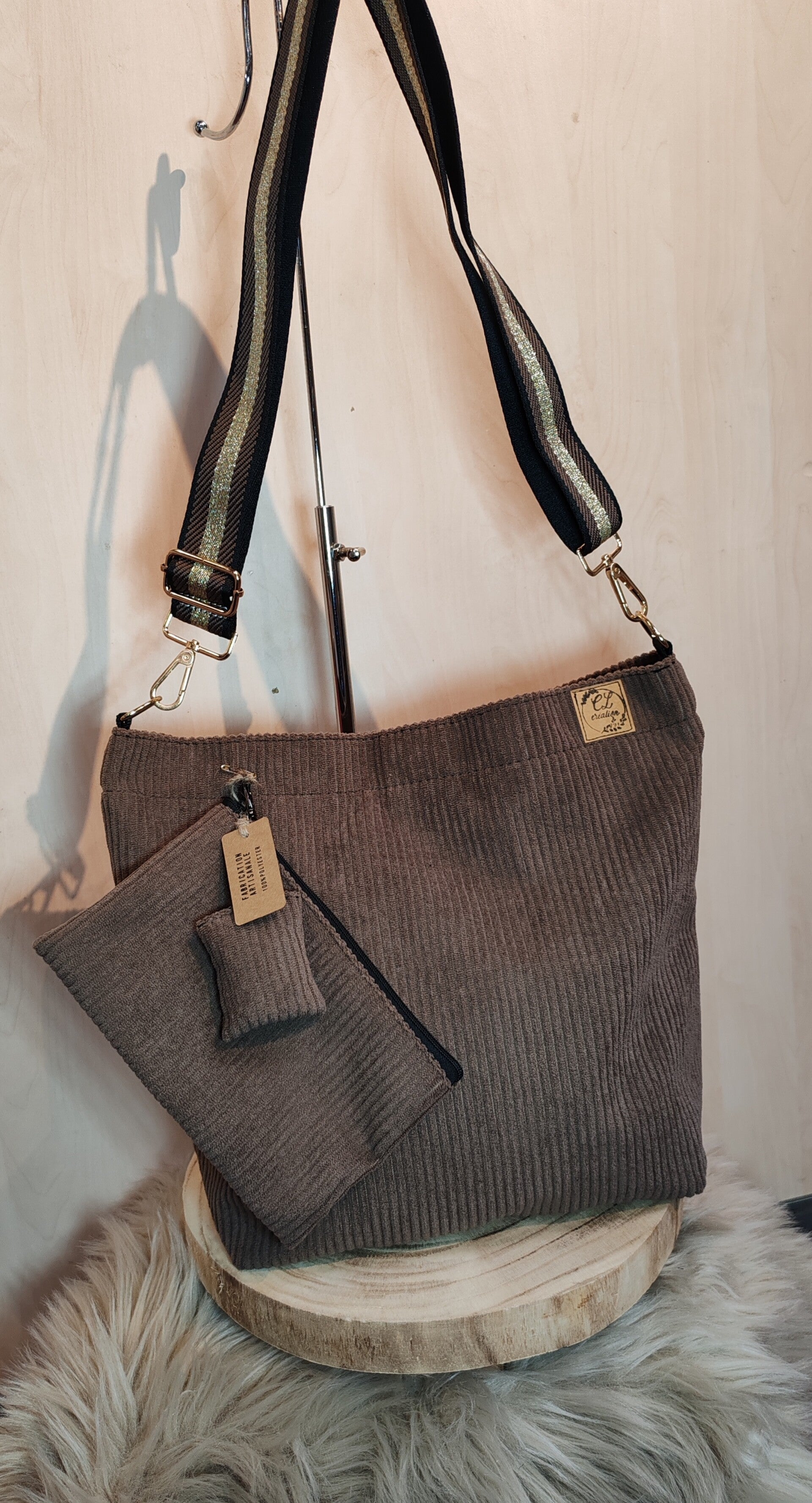 Joli sac bandoulière en velours côtelé de couleur marron, doublé avec une poche intérieure plaquée.