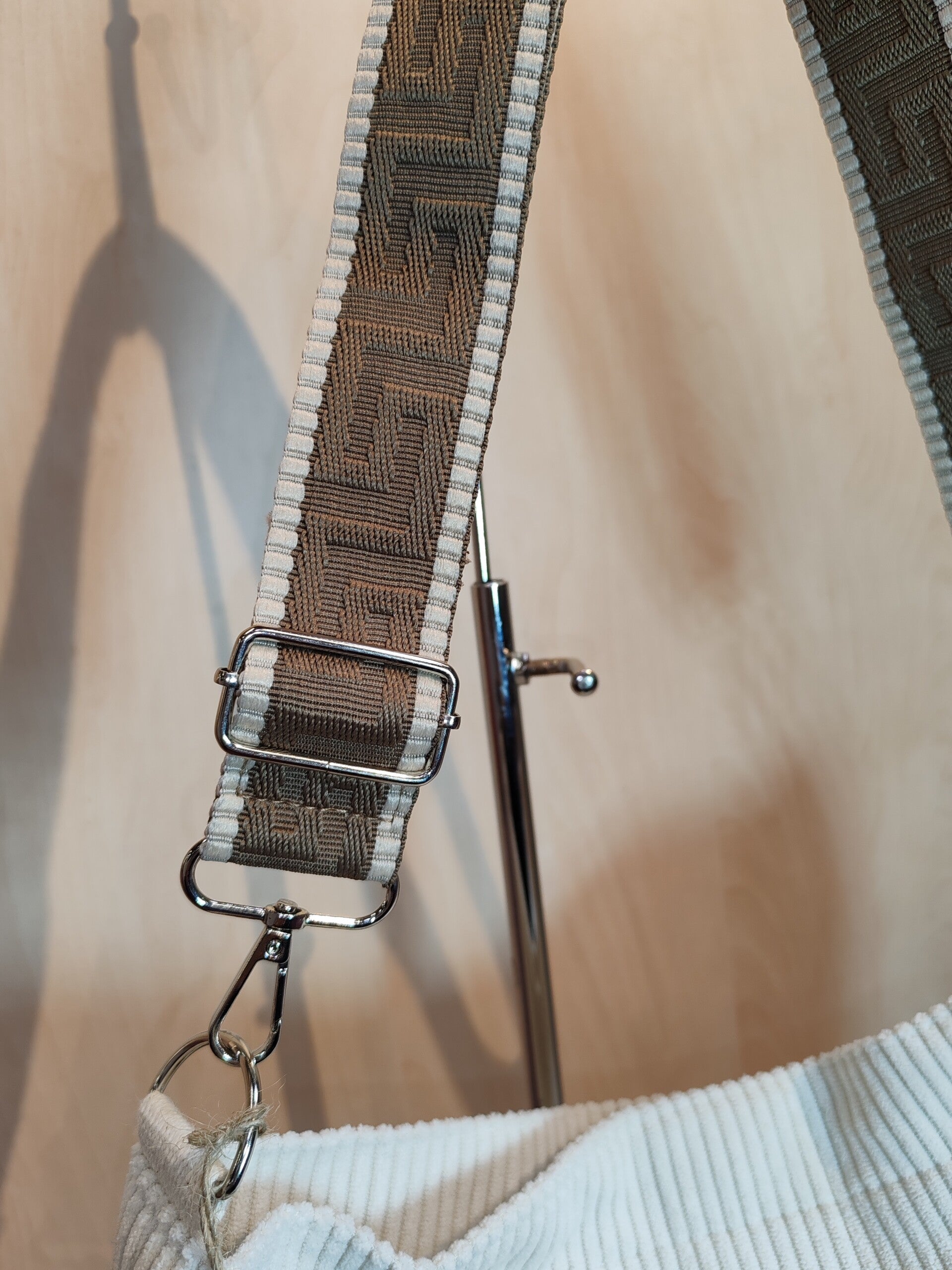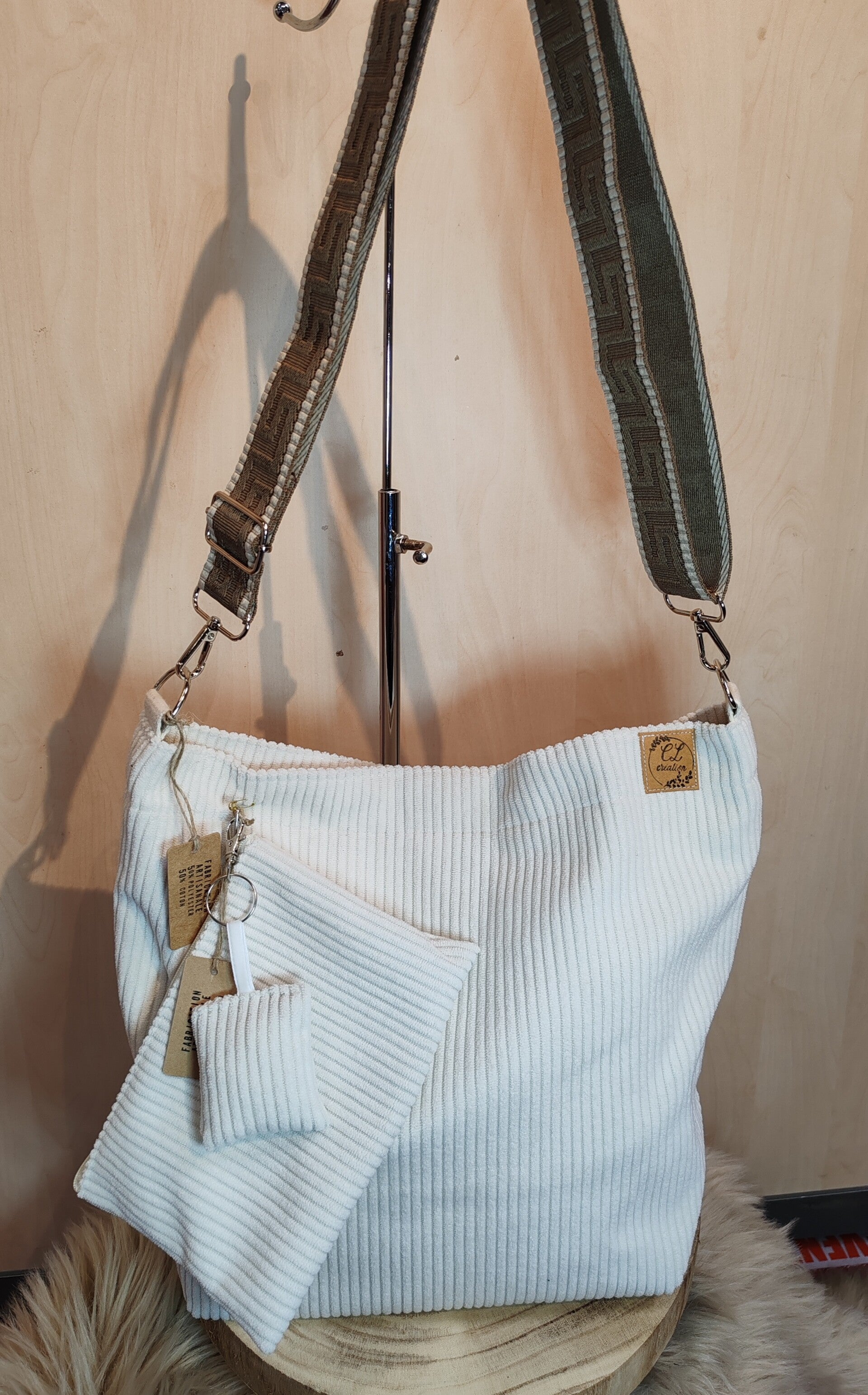 Joli sac bandoulière en velours côtelé de couleur écru, doublé avec une poche intérieure plaquée.