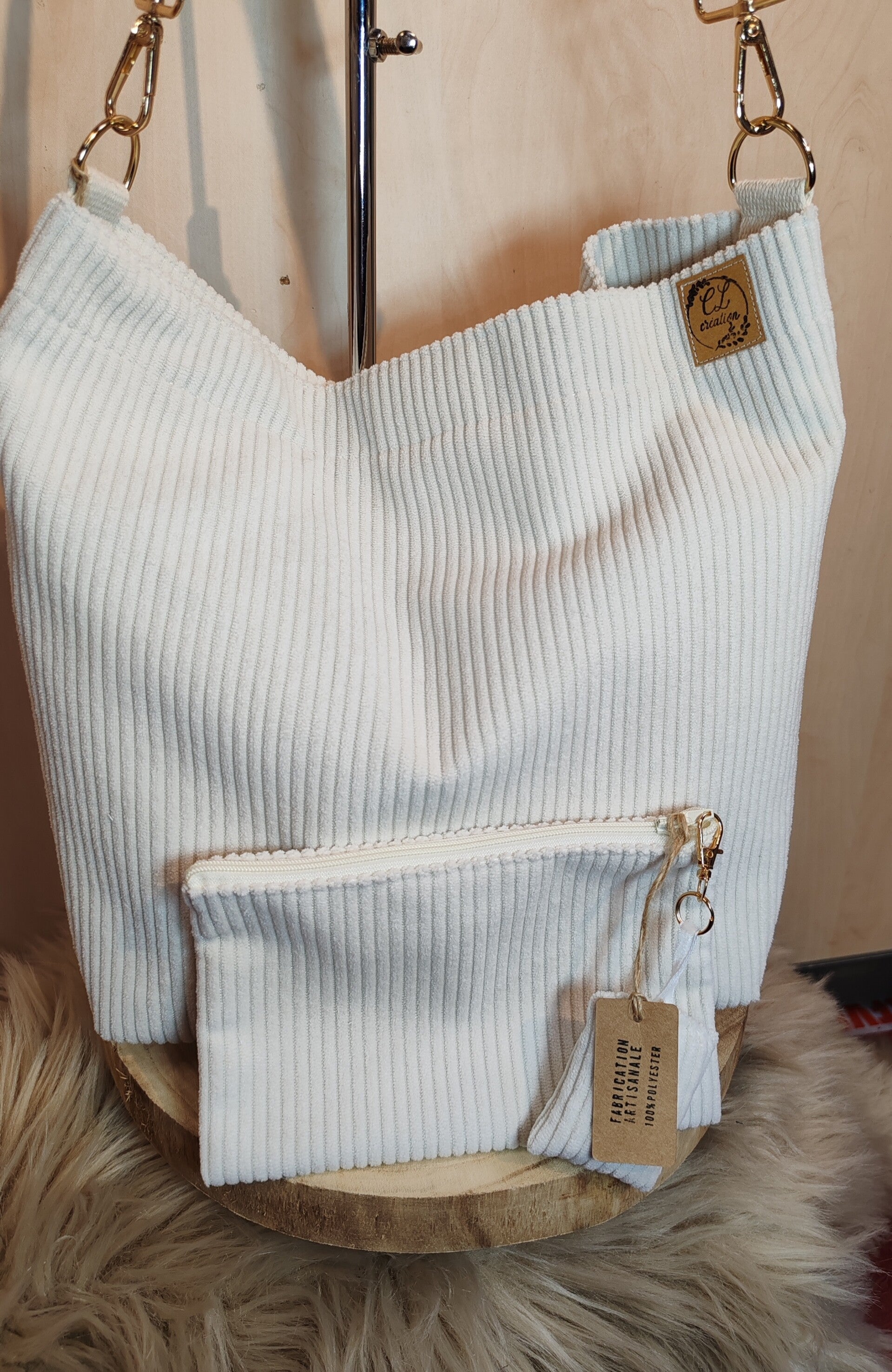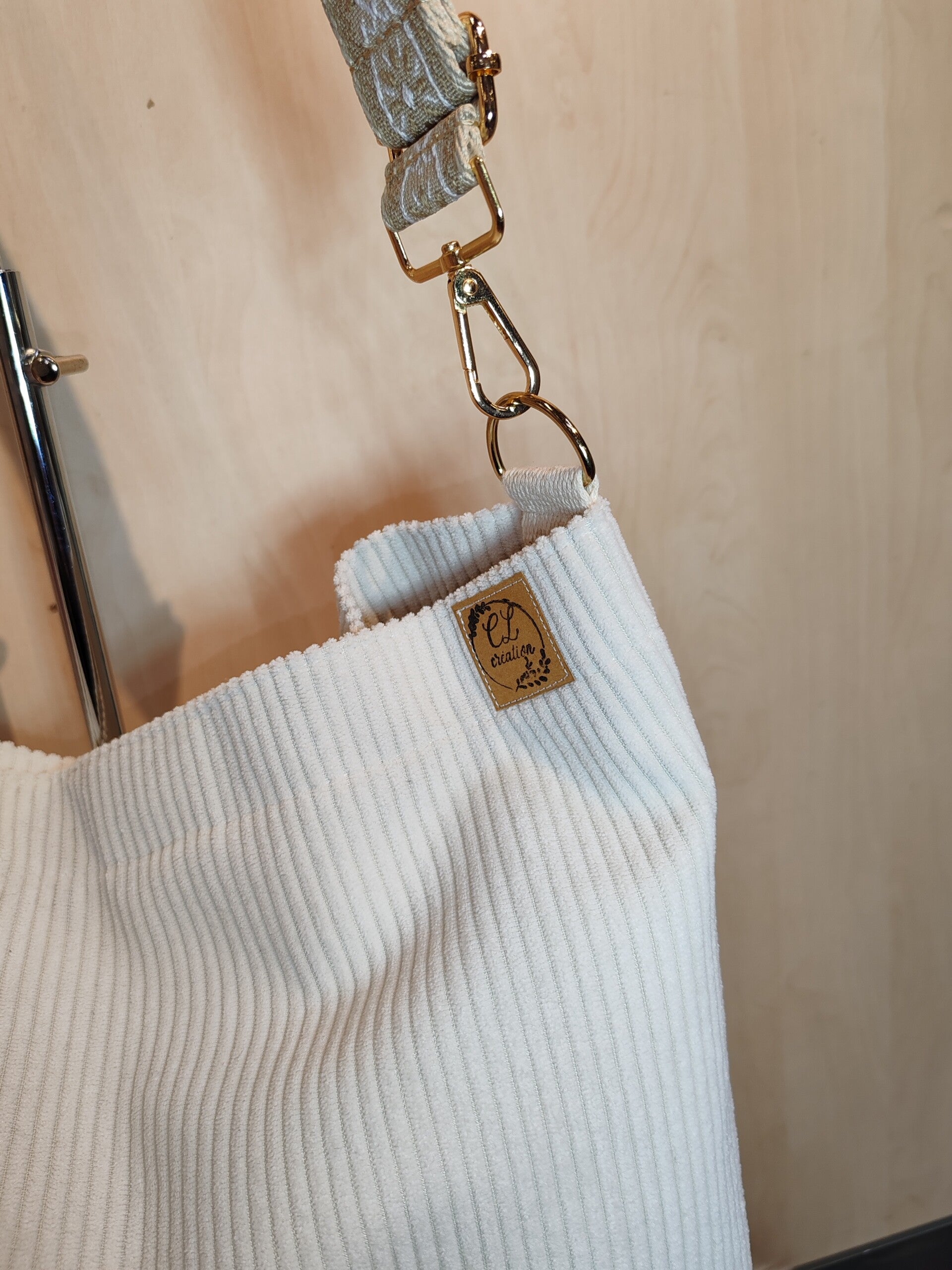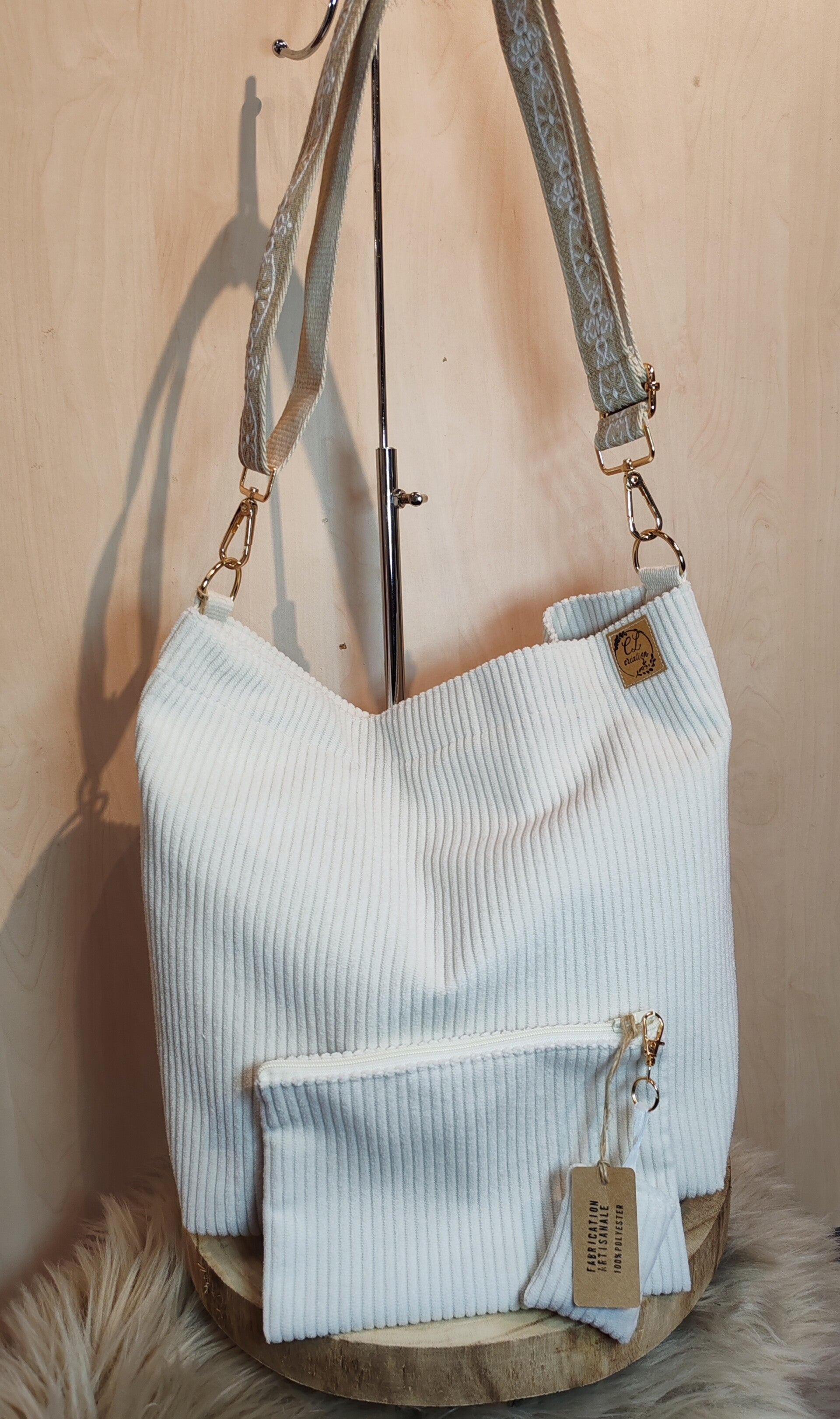 Joli sac bandoulière en velours côtelé de couleur écru, doublé avec une poche intérieure plaquée.