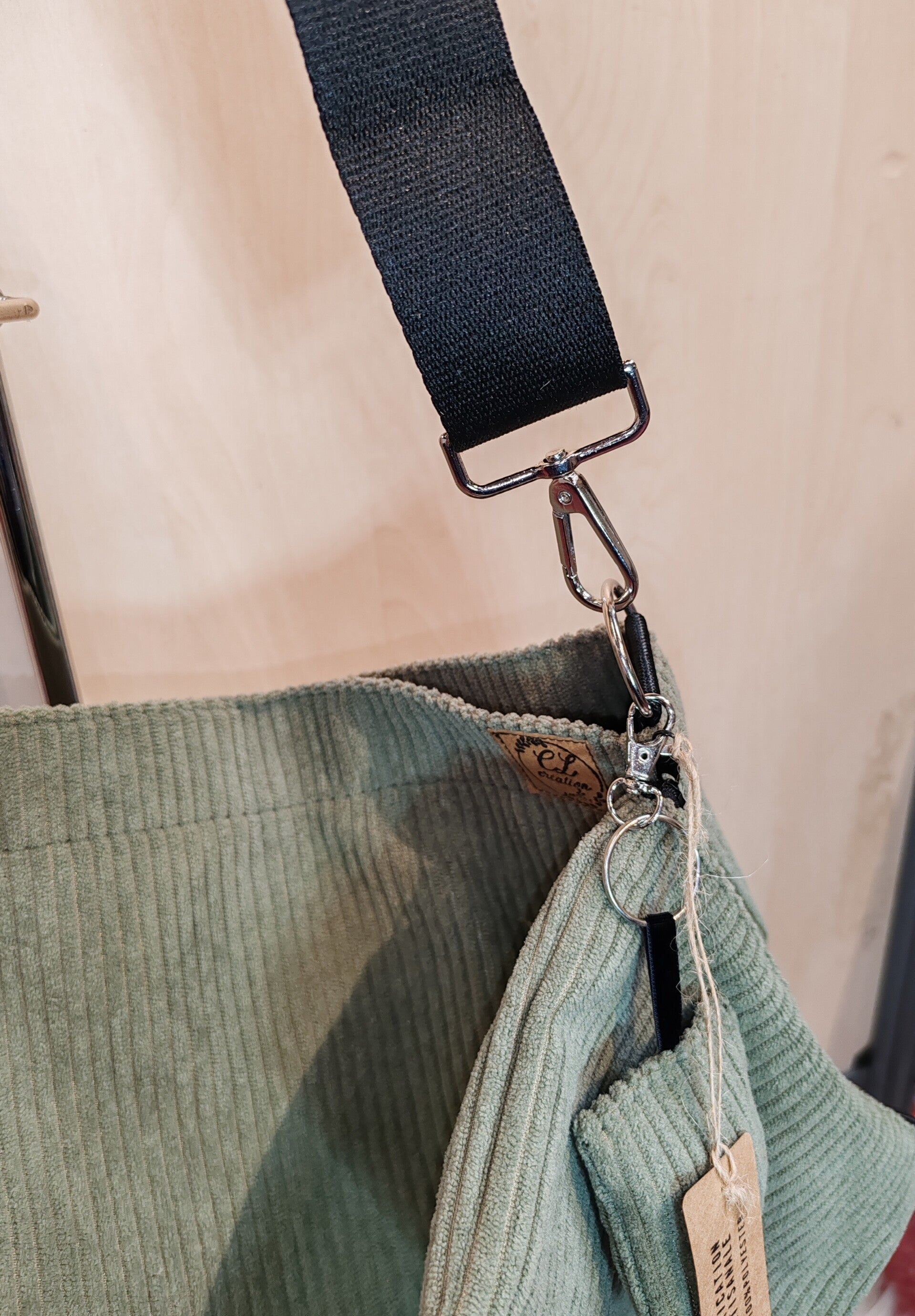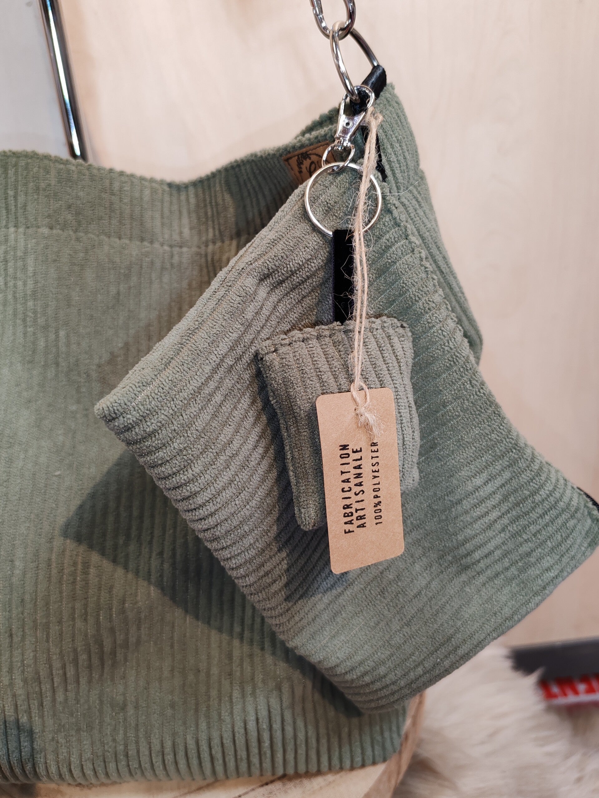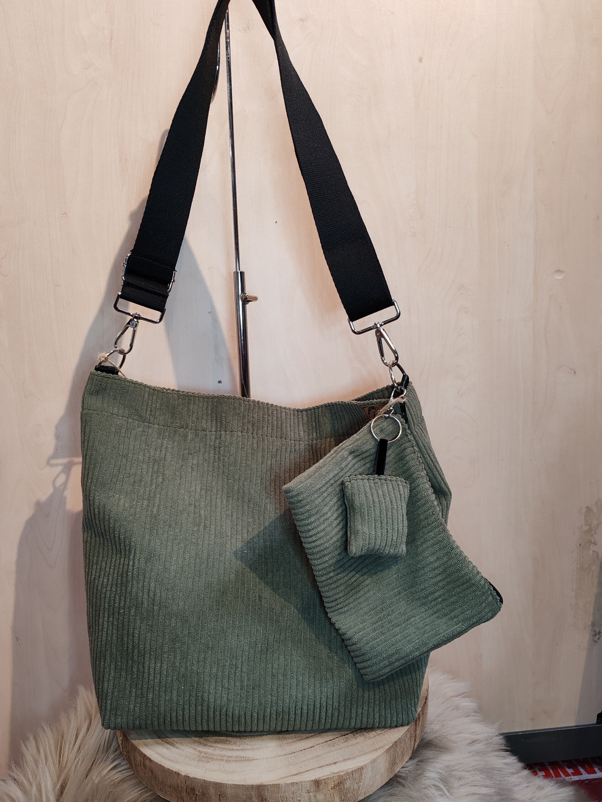 Joli sac bandoulière en velours côtelé de couleur kaki, doublé avec une poche intérieure plaquée.