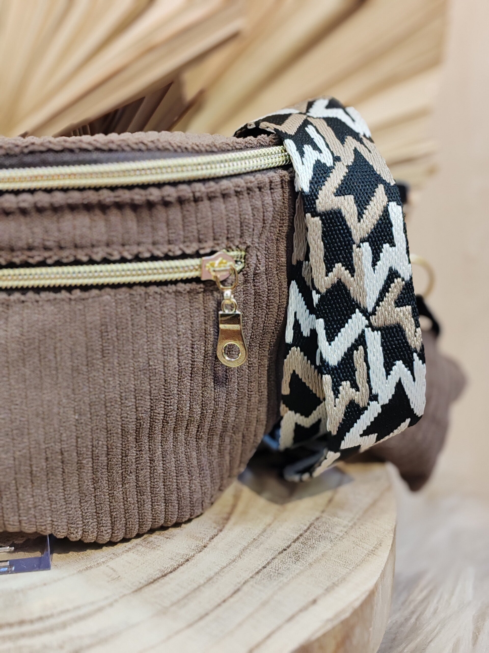 Toujours d'actualité, la sacoche banane, ici en velours côtelé marron.