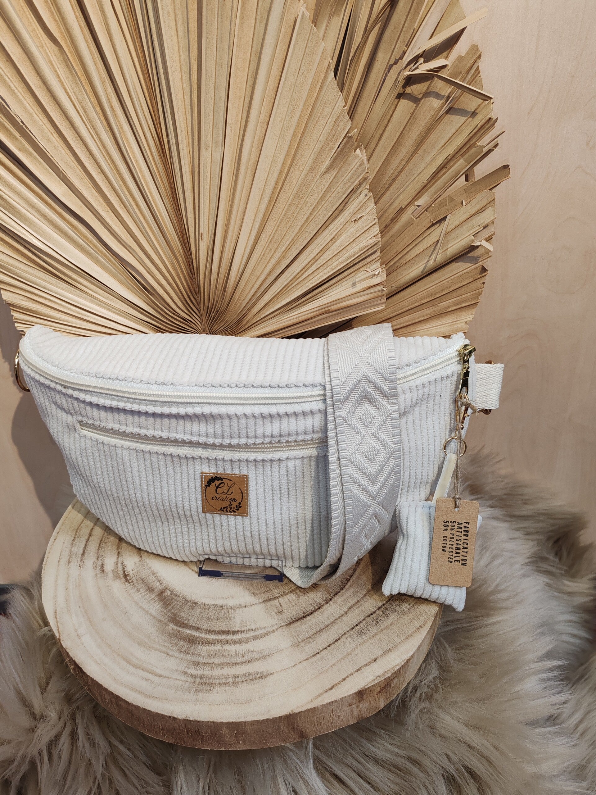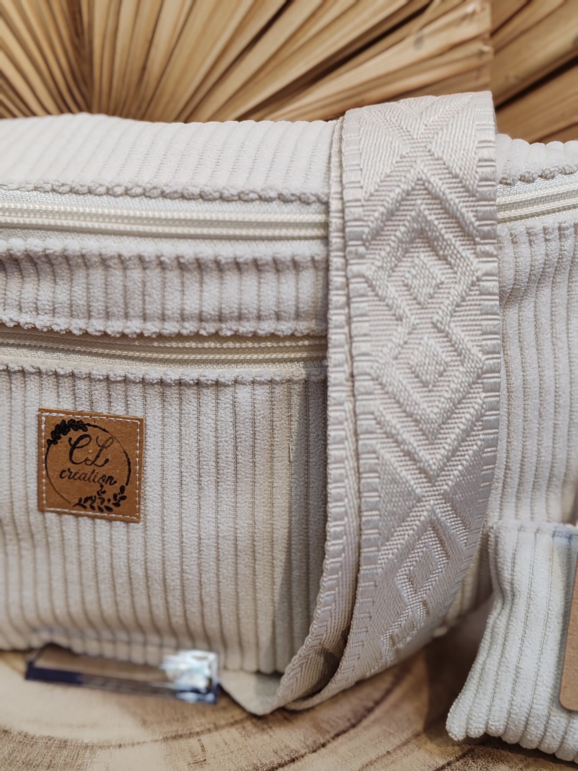 Véritable accessoires de mode, la sacoche fait son retour depuis quelques saisons, ici en velours côtelé de couleur écru, doublée avec une poche intérieure plaquée et une deuxième poche zippée devant, idéale pour portable, papiers, clés etc....