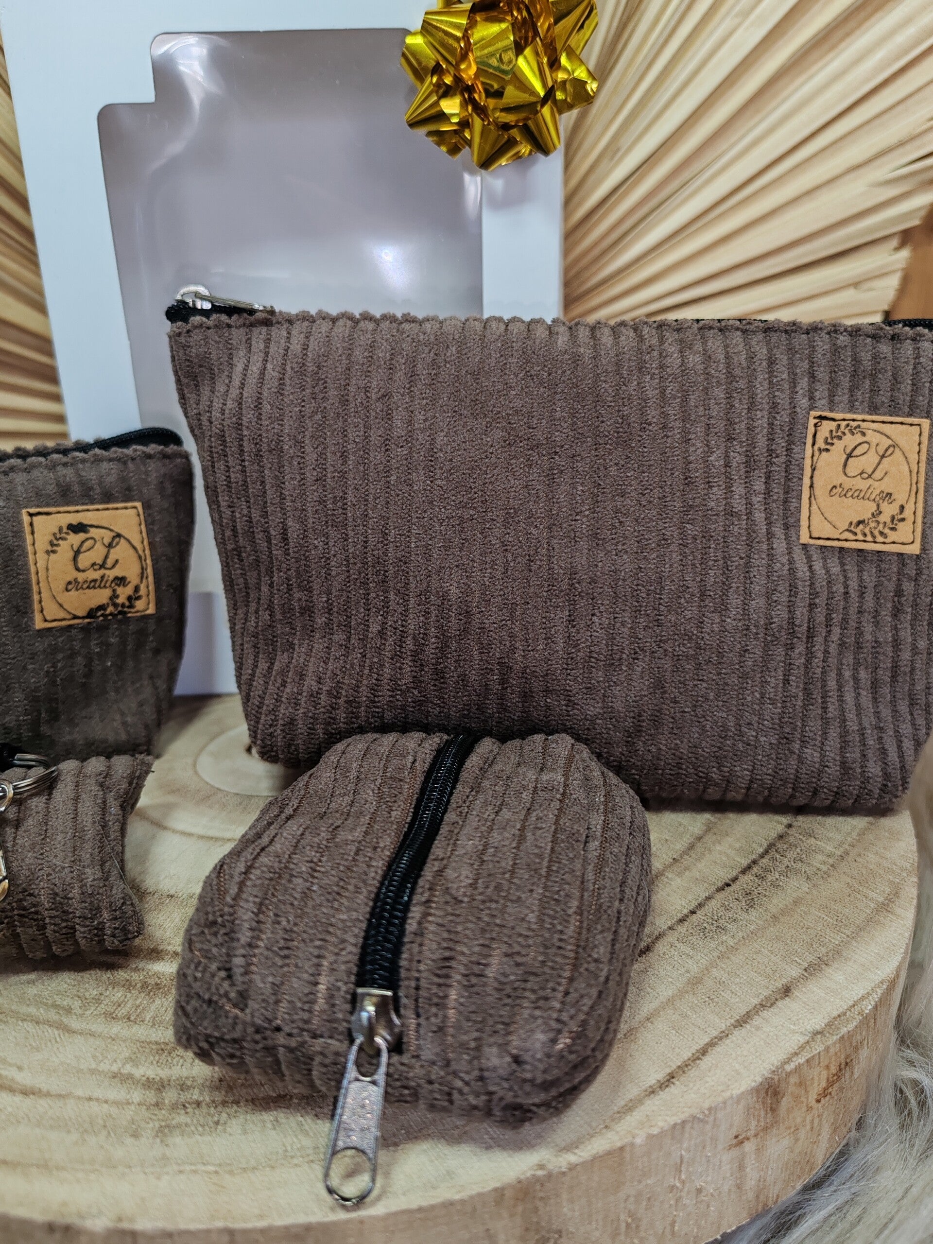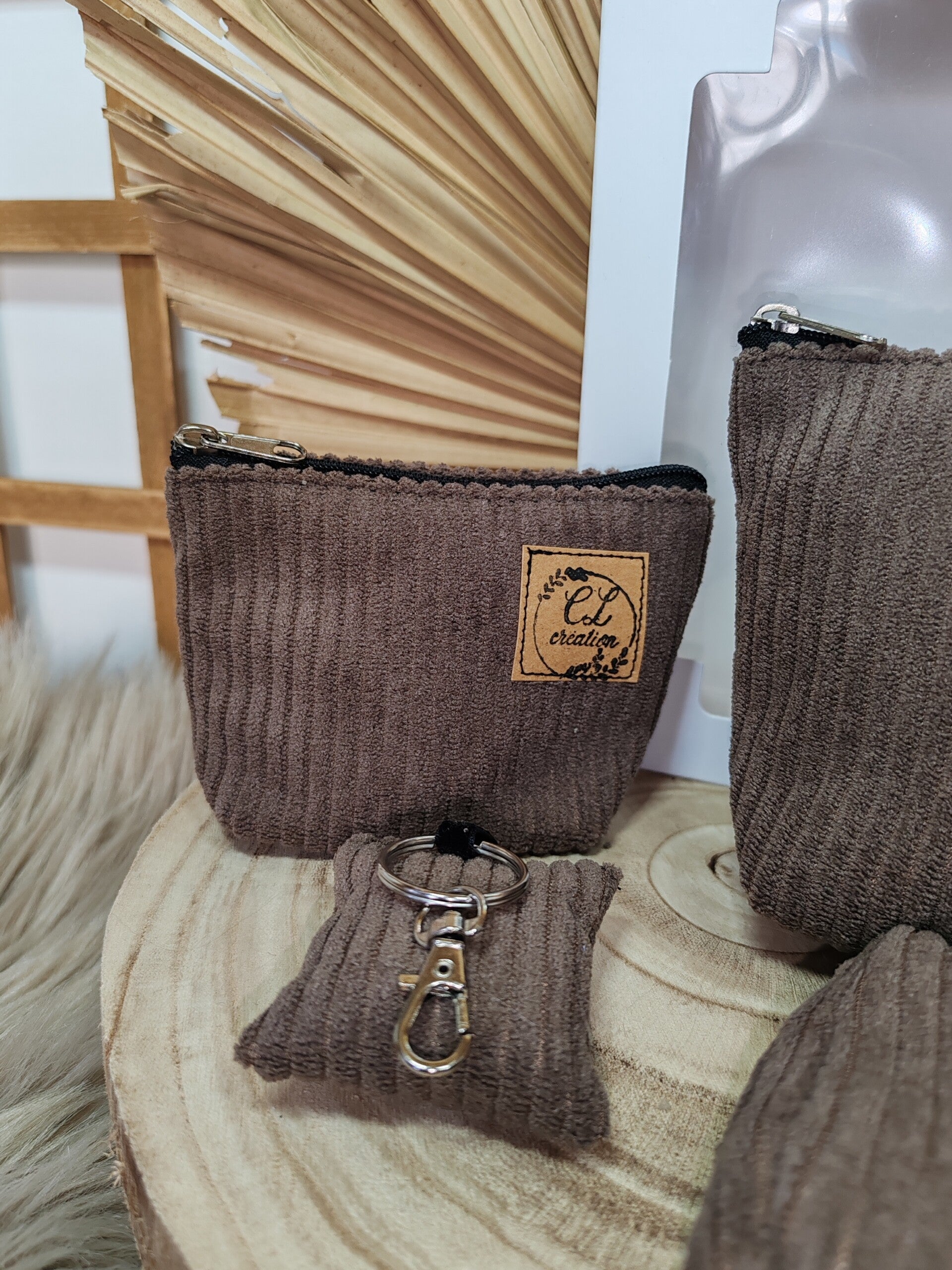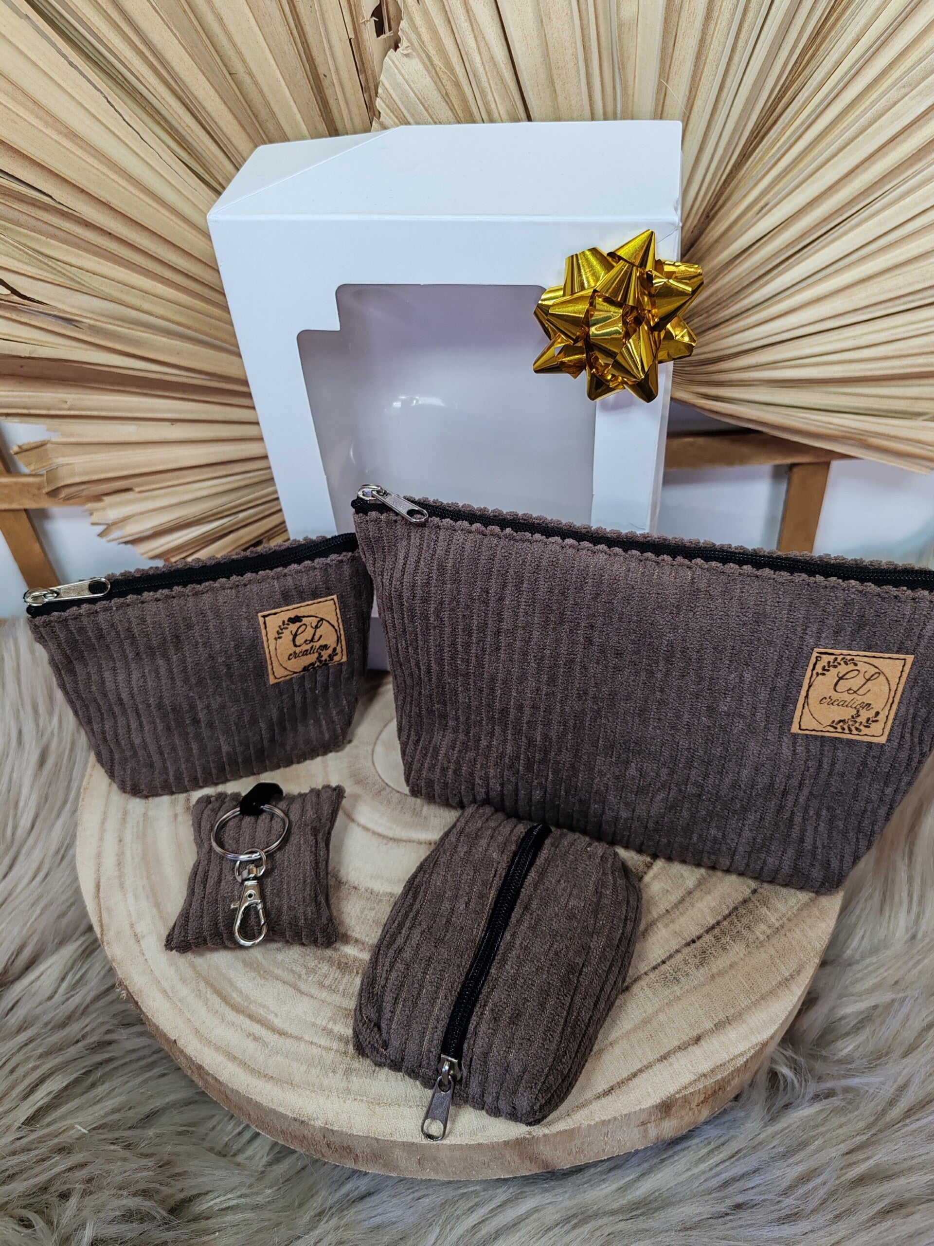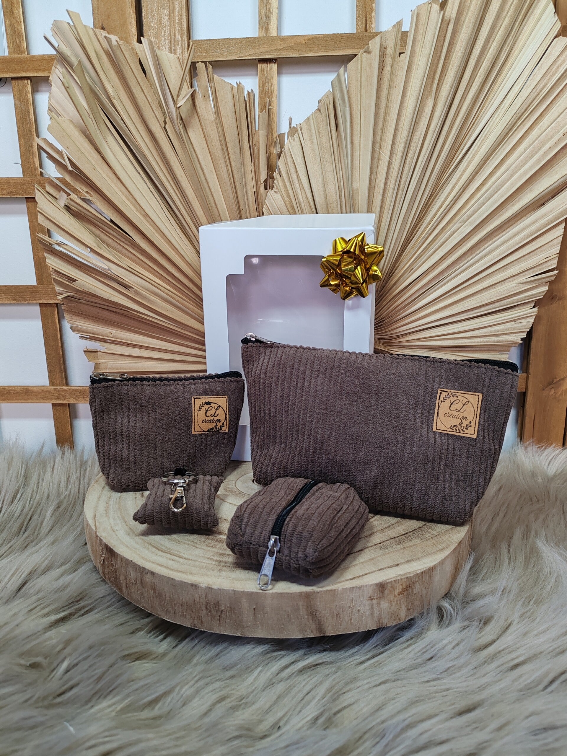 Voici un coffret comprenant une pochette de sac, un porte cartes, un porte clés et un porte monnaie.